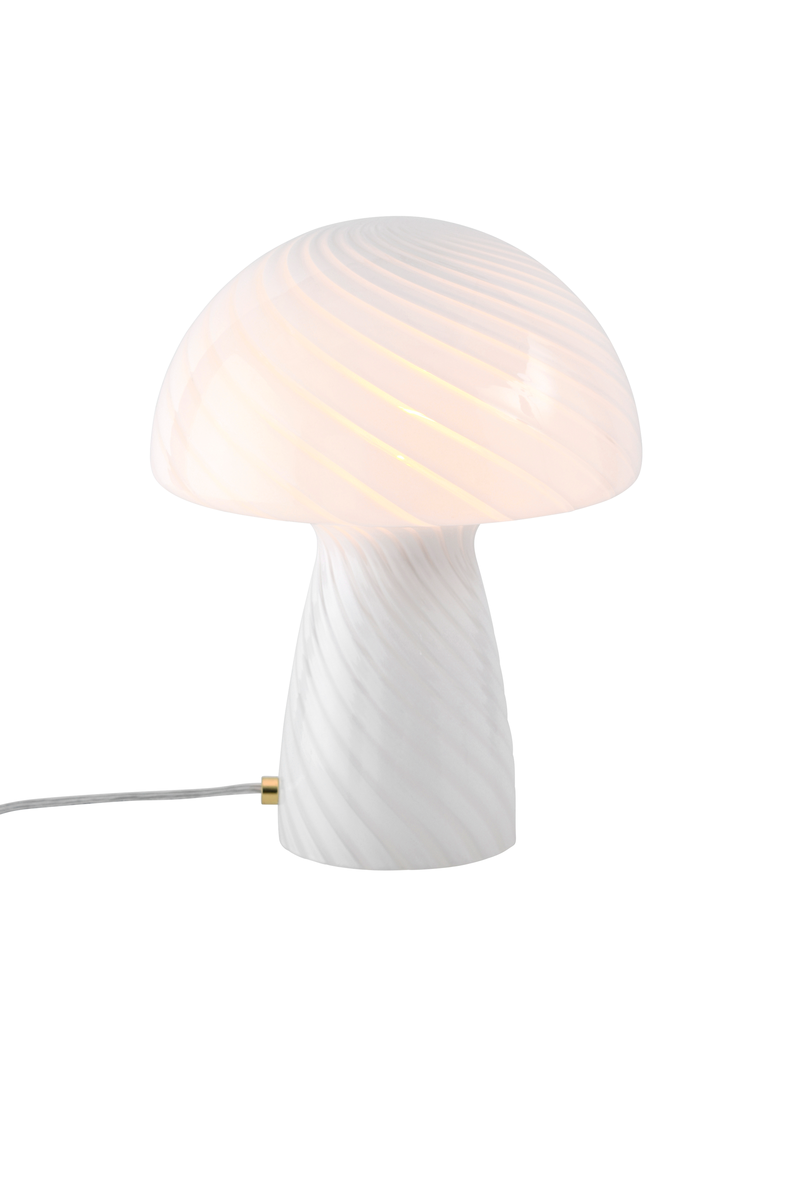 Bordslampa gjord av vitrandigt, blankt glas med vitlackad innertub och extern synlig detalj i pläterad mässing. Diameter 22 cm, höjd 30 cm. Transparent sladd med strömbrytare.