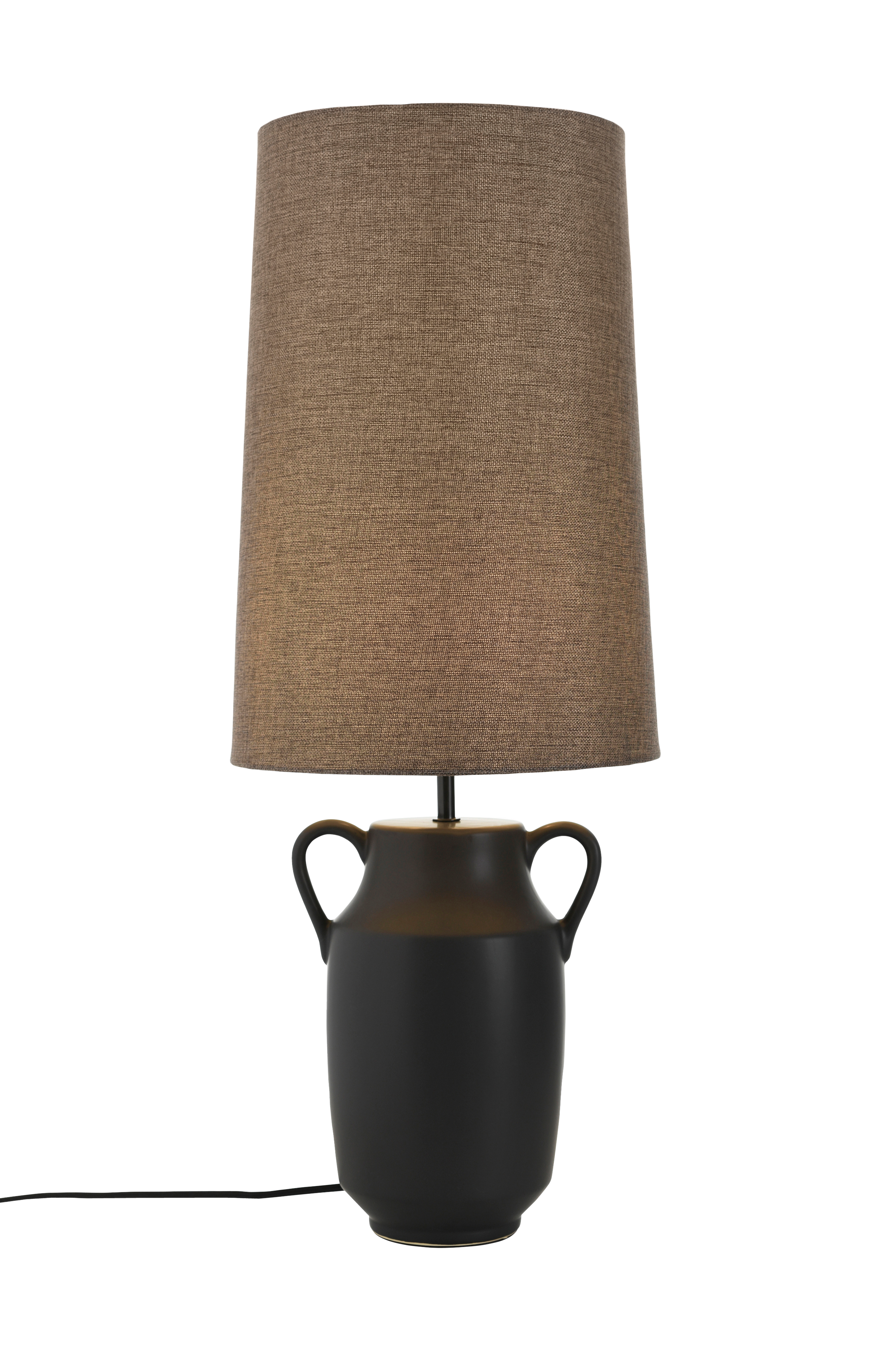 Bordslampa med fot av keramik i matt svart finish och hög skärm i grövre bomullstyg.