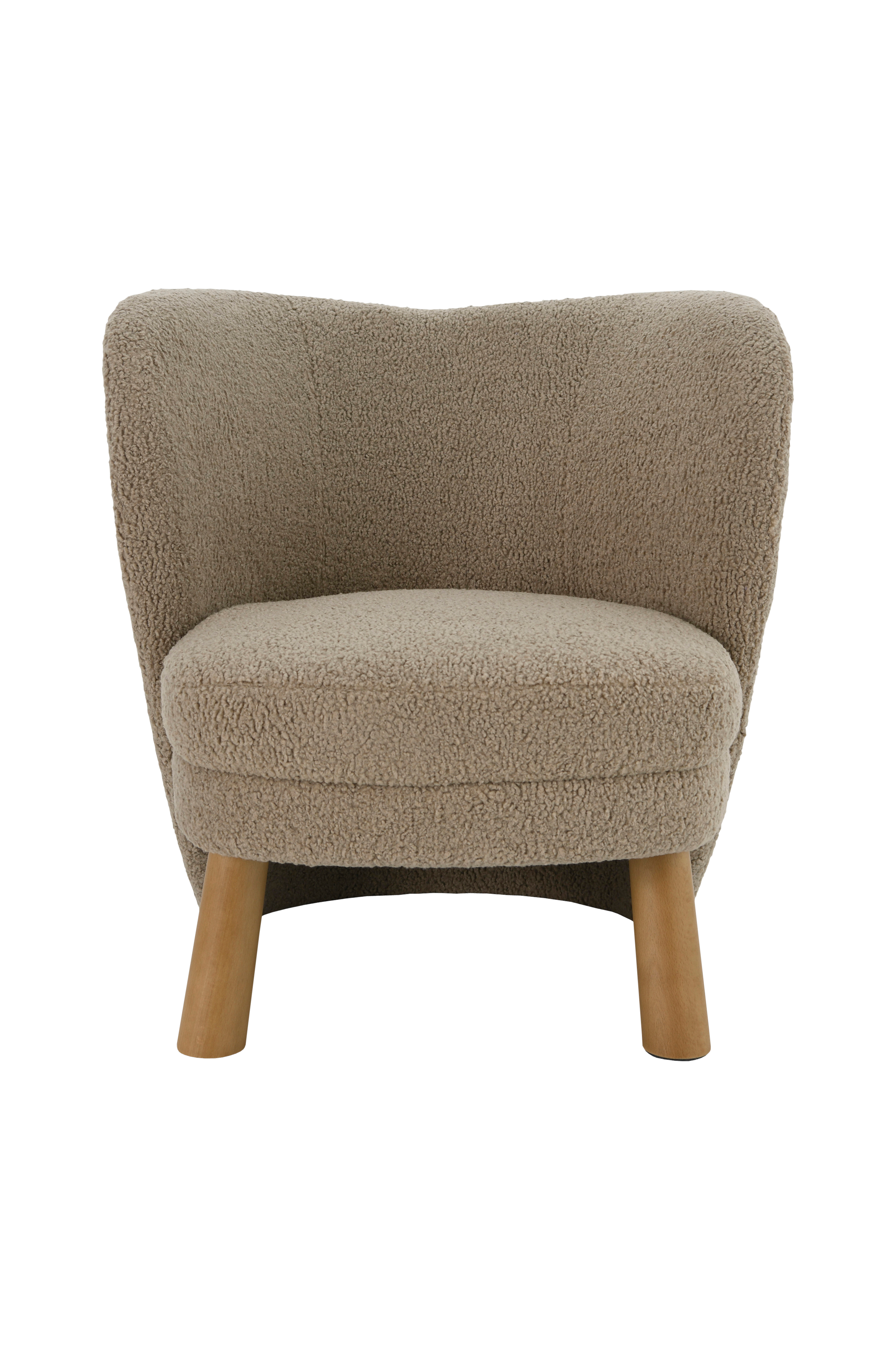 Fåtölj i modern design med rygg som går ända ner till golvet. Stomme i furu och plywood och ben i ask. Klädsel i fårskinnsimitation av 100% polyester. Nozagfjädrar och skumfyllning. Frihöjd under möbel 21 cm. Levereras monterad.