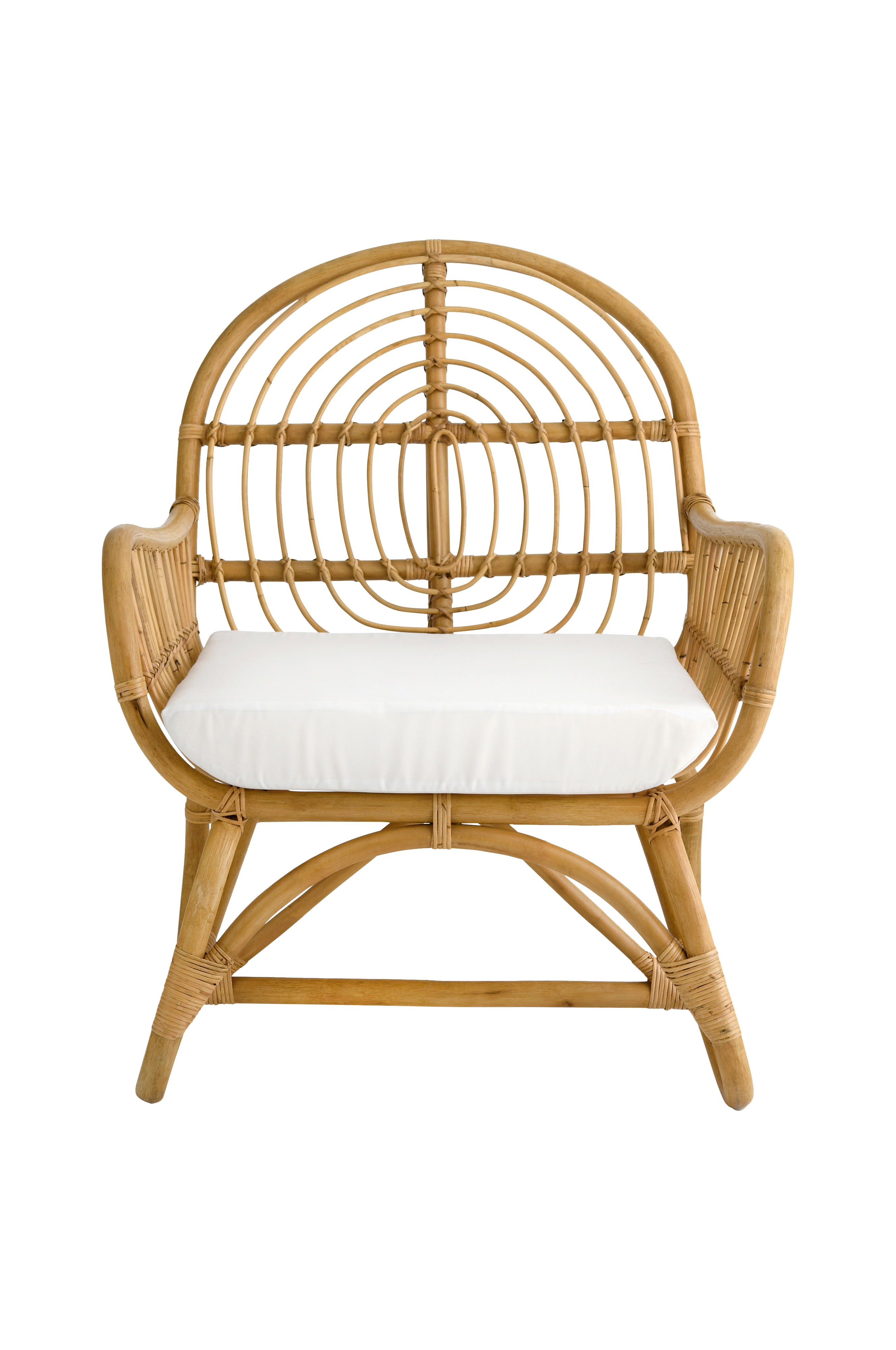 Fåtölj av rotting i modern design med bågformat mönster i ryggen. Dyna med tygklädsel och skumfyllning, dynans tjocklek 10 cm. Levereras monterad.