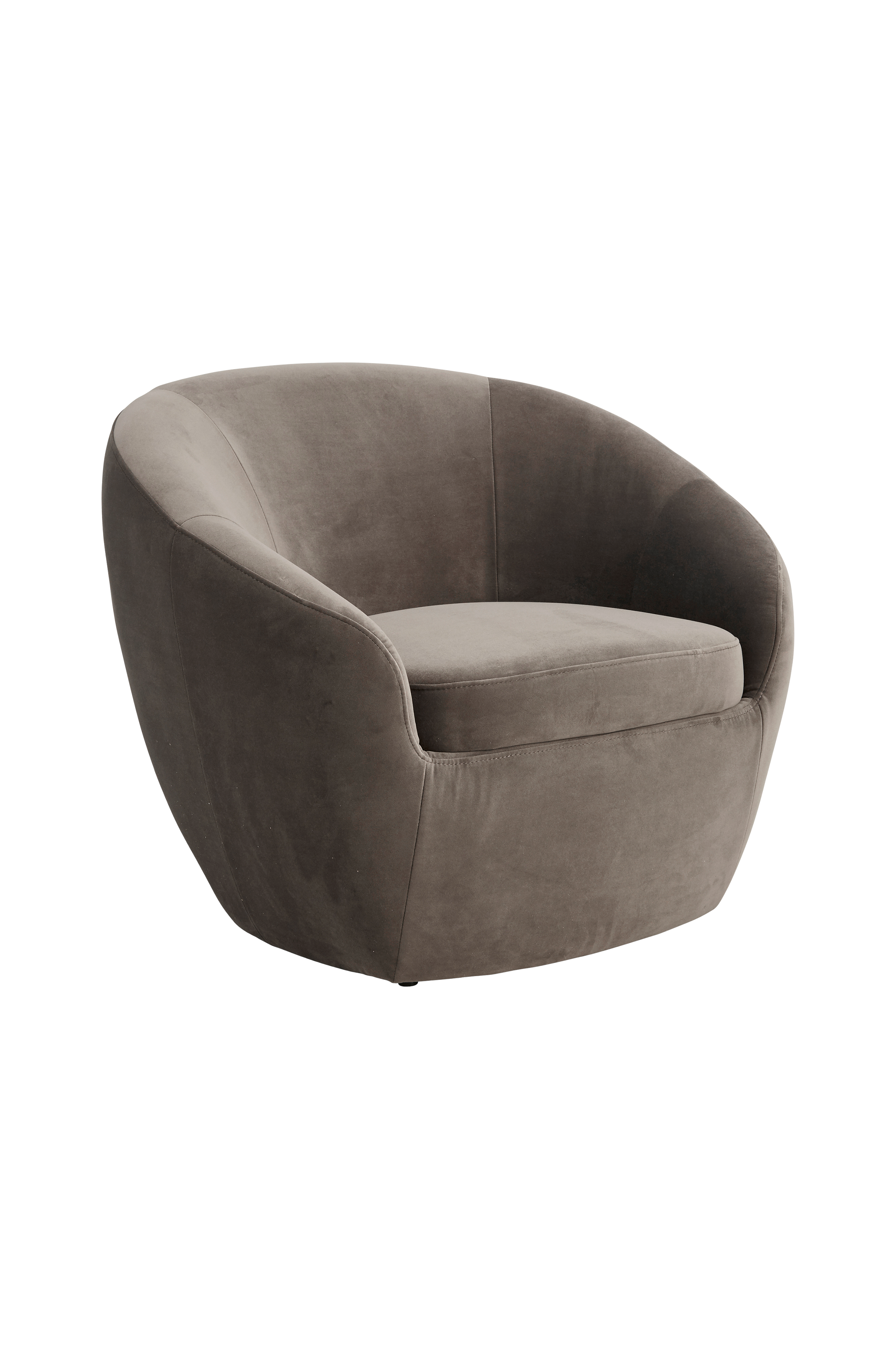 Fåtölj i modern design med runda former. Klädsel i sammet (gråbrun) eller chenille (sandbeige) av polyester. Ej avtagbar klädsel. Material i stomme, baksida och armstöd: Massiv furu och plywood. Resårband, fjädring, skum, polyestervadd. Sittplymå: nozagfjäder, resårband, skum, polyestervadd. Plastfötter. Mått: Bredd 87 cm, höjd 75 cm, djup 78 cm. Sitthöjd 42 cm, sittdjup 52 cm, sittbredd 55 cm.