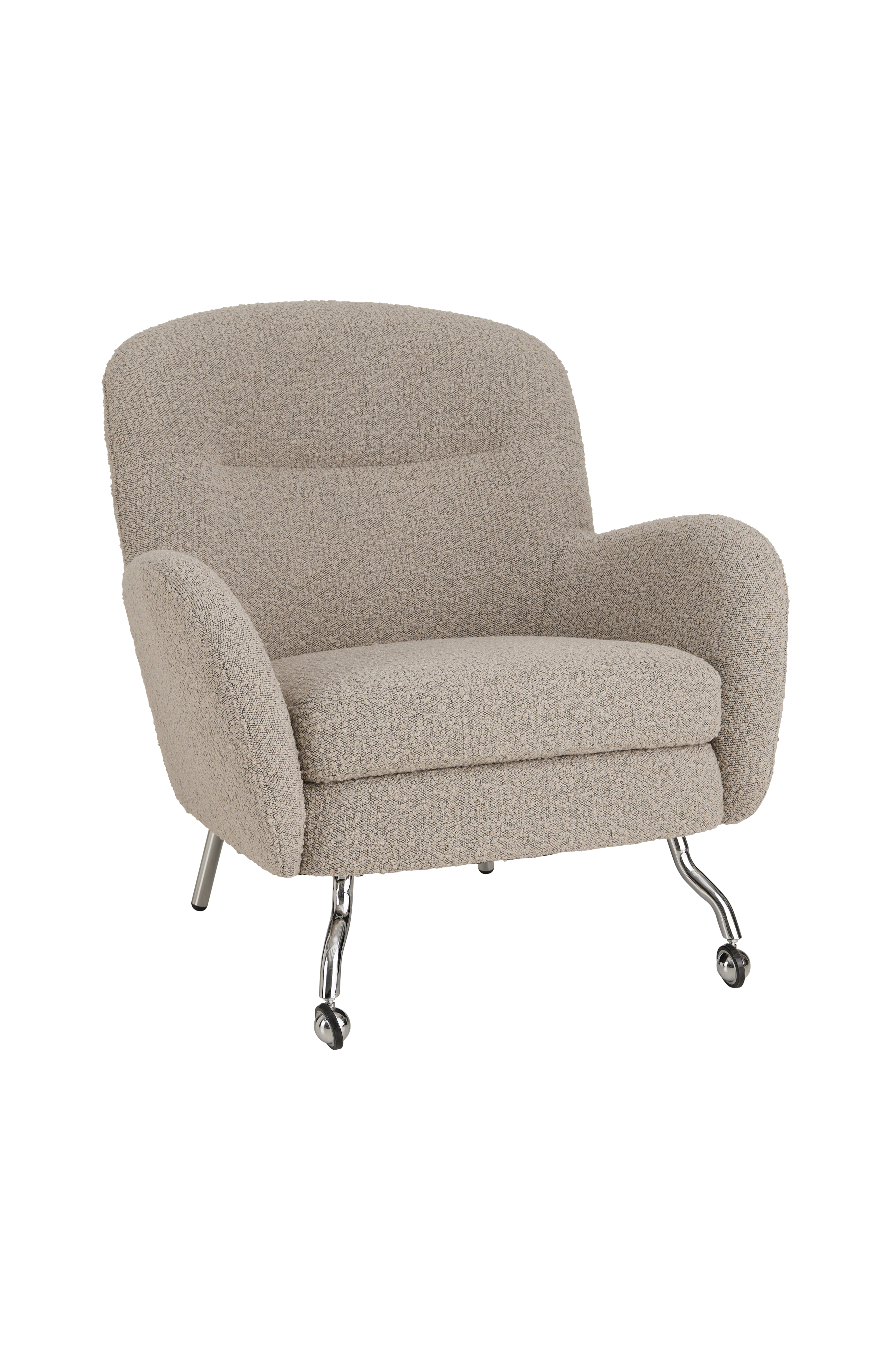 Fåtölj med hjul på det främre benparet. Klädsel i 95% polyester och 5% akryl. Skumfyllning. Ben av kromad metall. Frihöjd under möbel (benhöjd) 19 cm. Enklare montering.