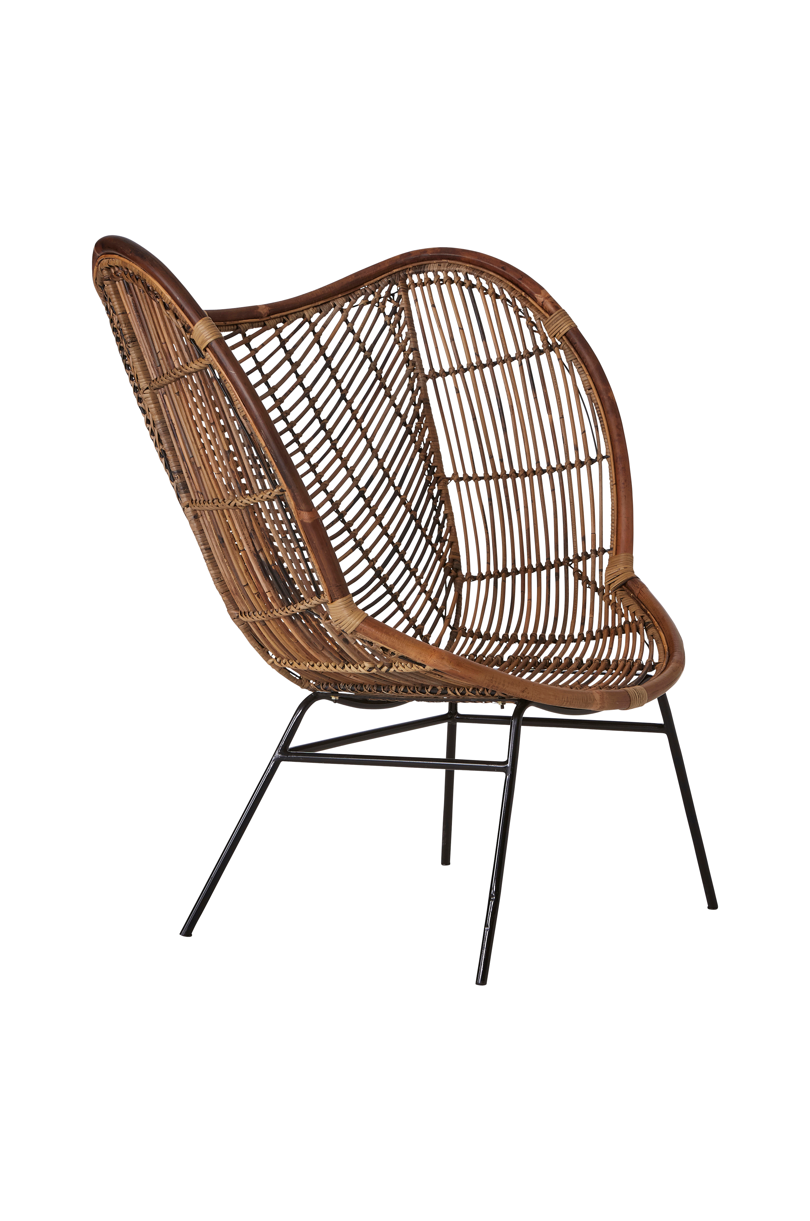 Fåtölj av rotting med svarta ben i pulverlackad metall. Barstolen bör placeras under tak eftersom rotting är känsligt för både väta och uttorkning.