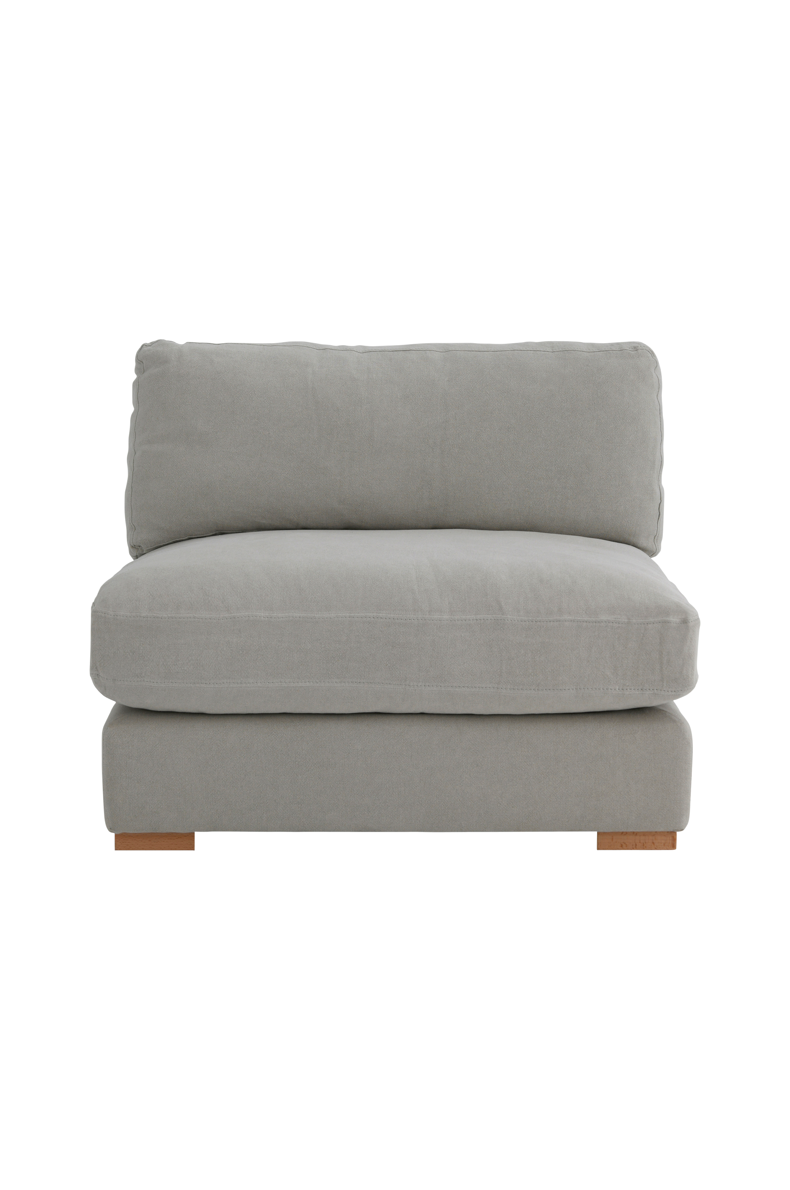 Fåtölj i modern design med klädsel av 100% lin. Stomme i furu och plywood. Skumfyllning i sittdynan samt fiber- och fjäderfyllning i ryggdynan för extra komfort. Avtagbar klädsel på dynorna. Frihöjd under möbeln 3 cm. Levereras monterad.