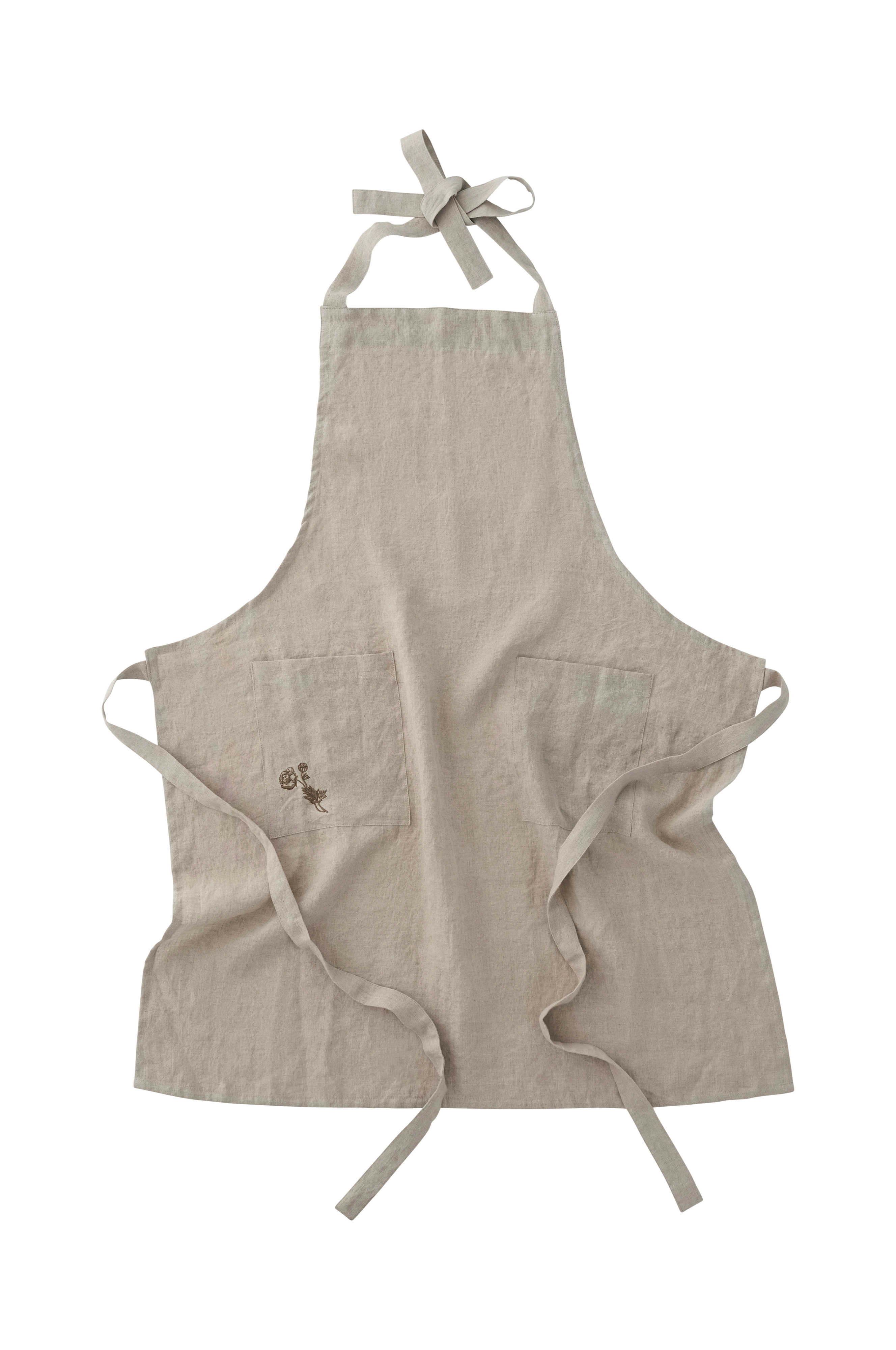 Ett förkläde som passar lika bra i köket som i trädgården. Det är gjort i en mjuk kvalitet av tvättat lin och har breda knytband runt midjan och i nacken. Två djupa fickor och en broderad blomma på den ena fickan.