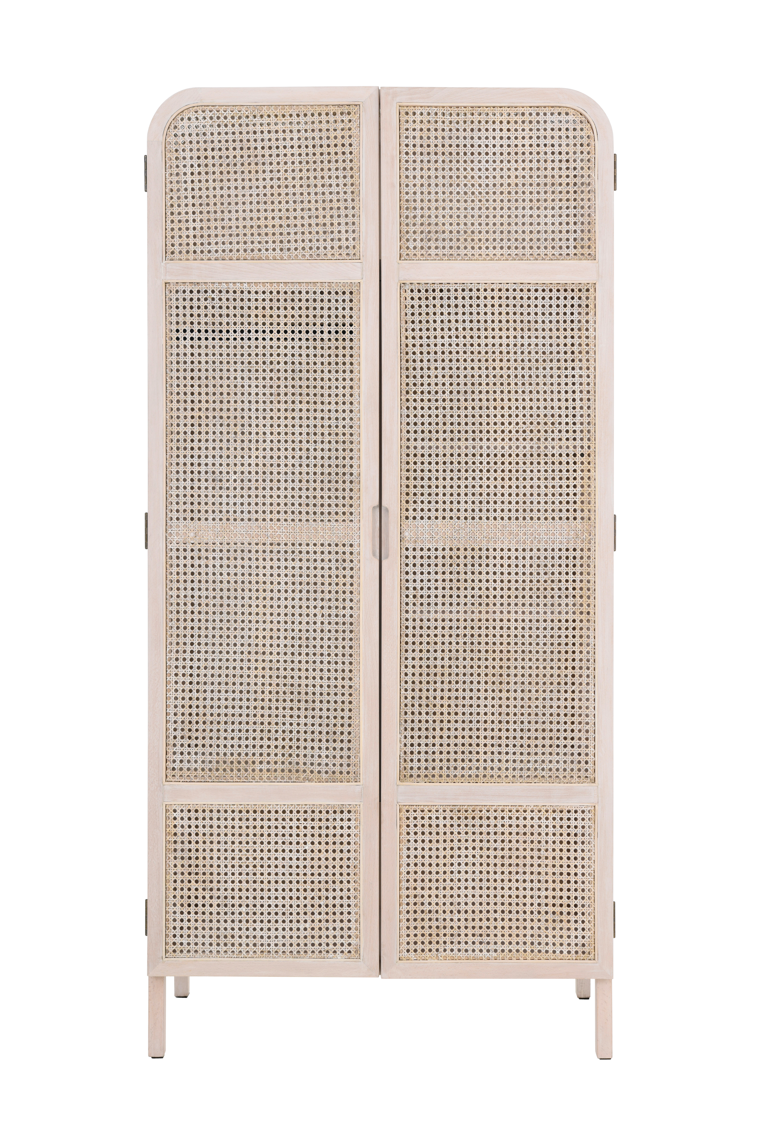 Garderob i björk och rotting med två dörrar. Totala mått: Bredd 84,5 cm, höjd 177,5 cm djup 52 cm. Inne i garderoben finns en överhylla, en underhylla, tre mindre hyllor samt en hylla med klädhängare.