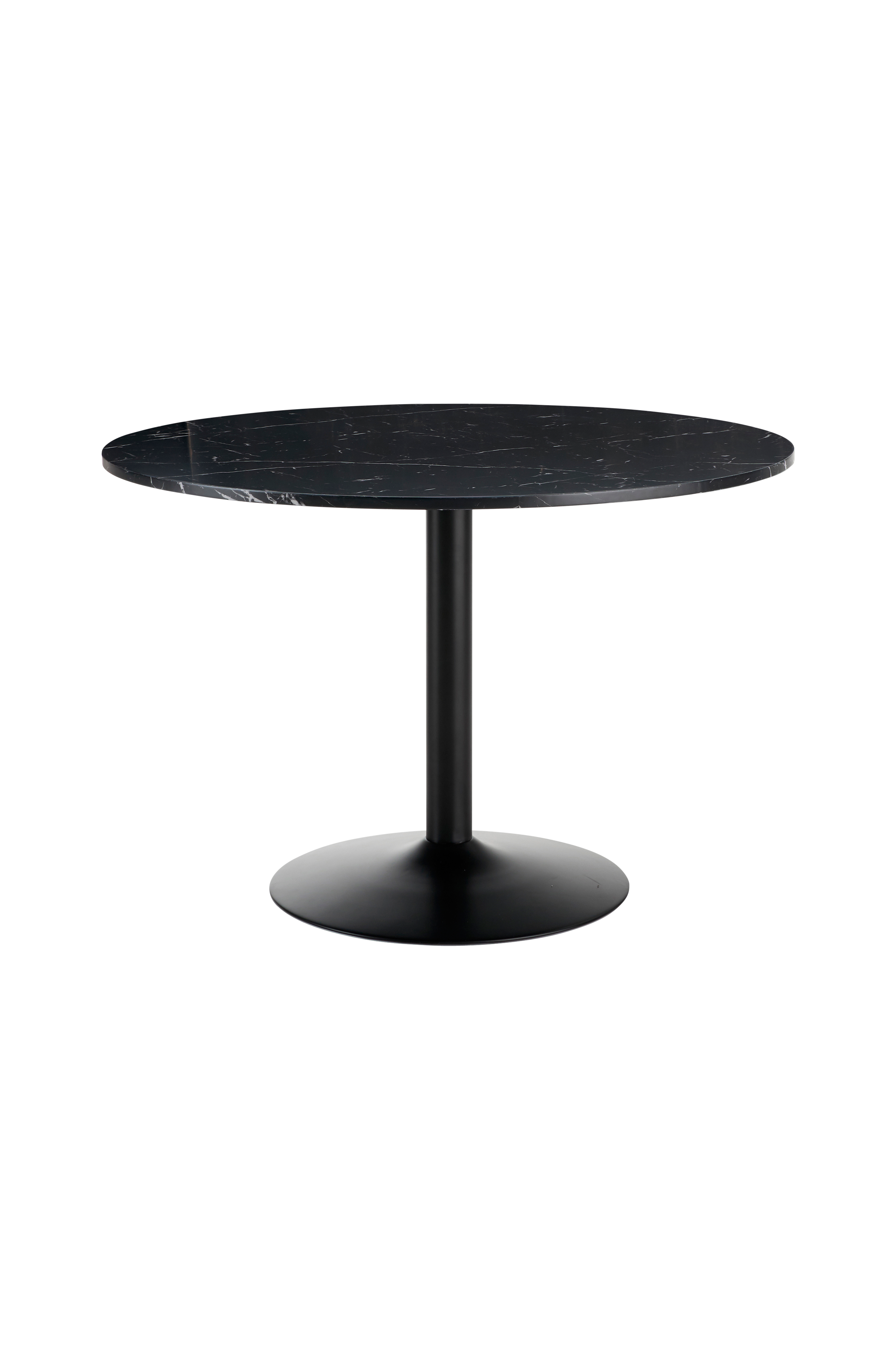 Runt köksbord i välarbetad modell. Bordsskiva av folierad MDF i naturtrogen marmorlook med en tålig, vattenavvisande yta. Trumpetfot av pulverlackad metall. Ø 110 cm, höjd 75 cm.