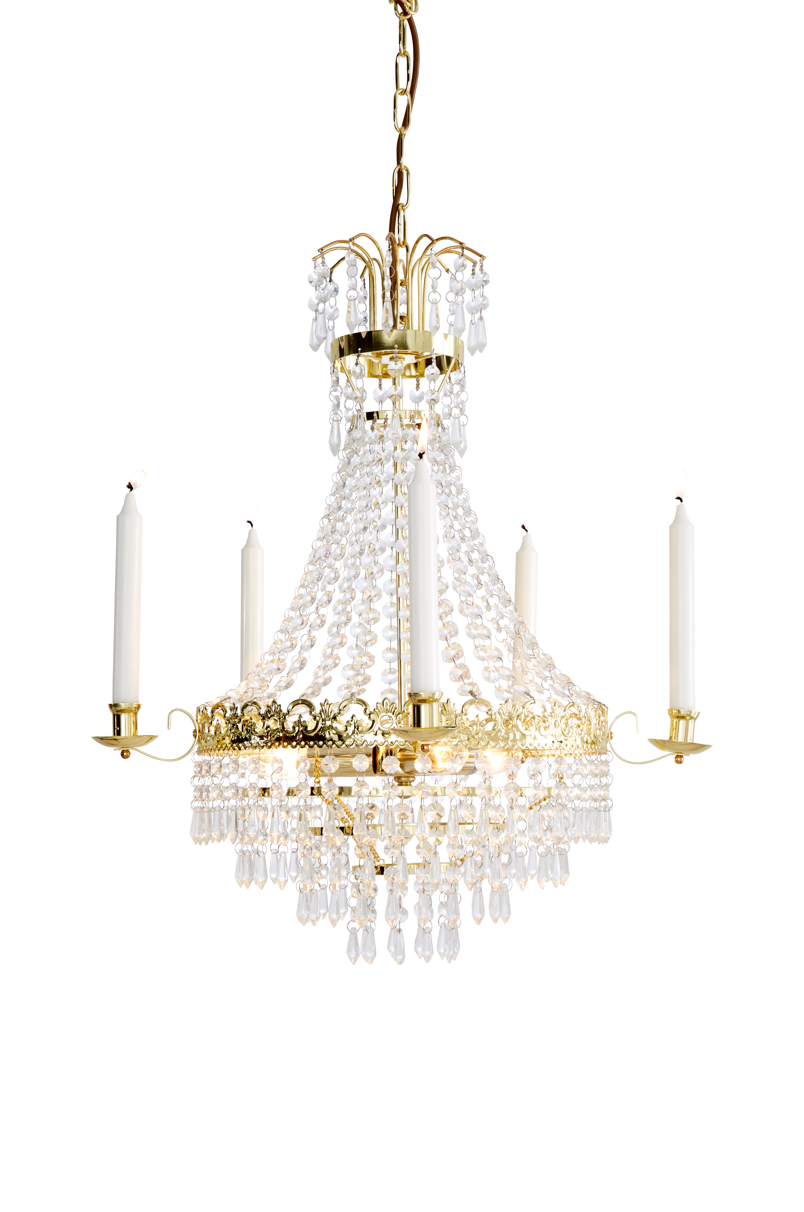 Metallstomme med handslipade prismor i blyfritt glas. Fem ljushållare. Ø 24 mm. Höjd 60 cm. Total Ø 54 cm inkl. ljushållare. Max takavstånd 120 cm. Kedja 50 cm, kan kortas. 3xE14. Max 3x40W.