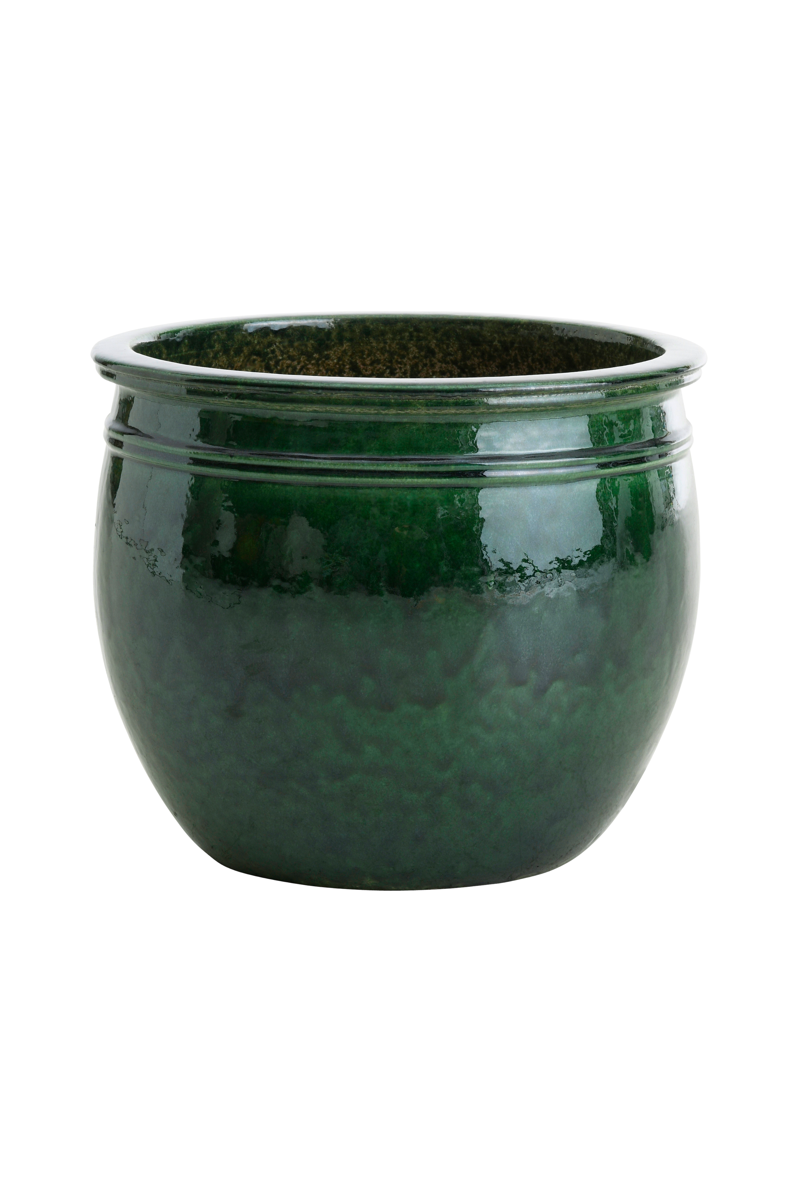 Robust kruka i glaserad keramik. Krukan är tillverkad för utomhusbruk och kan stå ute i minusgrader. Höjd 36,5 cm. Diameter upptill 43 cm. Innerdiameter 37 cm.