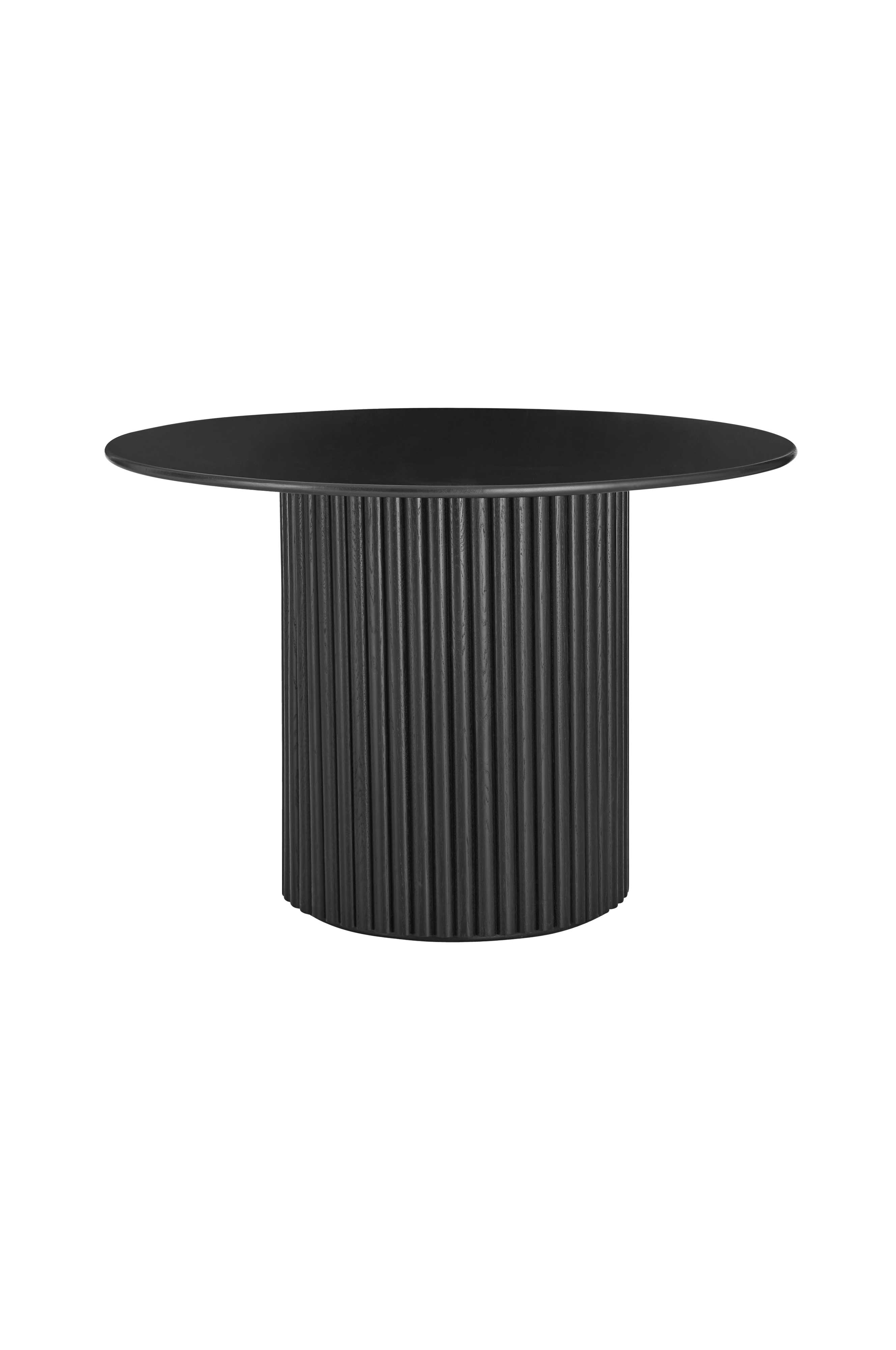 Runt soffbord i massiv ek. Toppskiva med rundade kanter. Rund, stabil bas i massivt trä och MDF med monterade stavar runt om som ger basen en ribbad struktur. Behandlat med vattenbaserat lack. Höjd 75 cm, diameter på toppskivan ca 110 cm. Diameter på basen 51 cm. Levereras omonterat.
