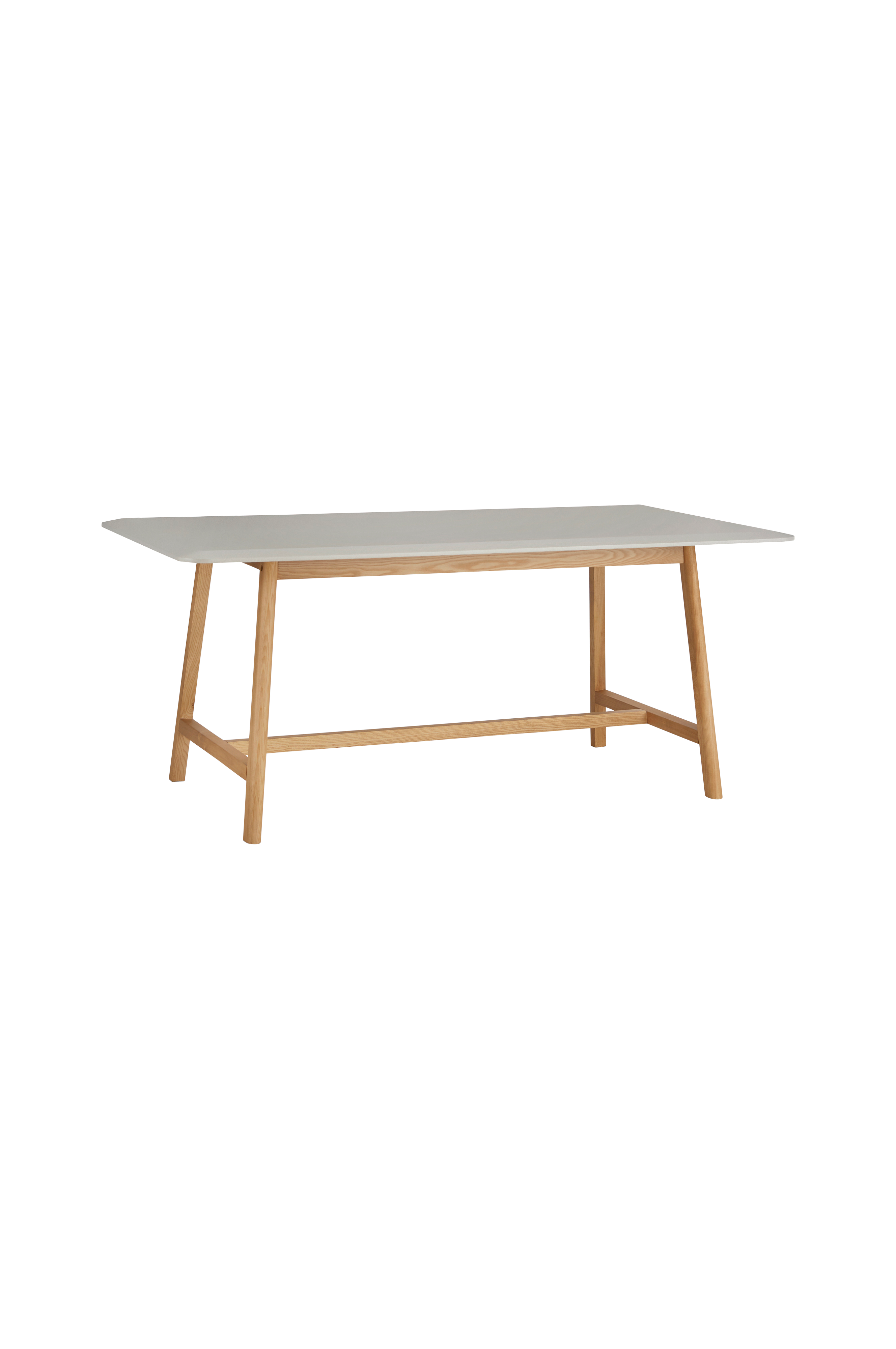 Köksbord med toppskiva av målad MDF i melerad färg och ben i massiv ask. Fasad kant på toppskivan. Stl 90x180 cm. Höjd 76 cm. Bredd mellan ben 126 cm. Enklare montering.