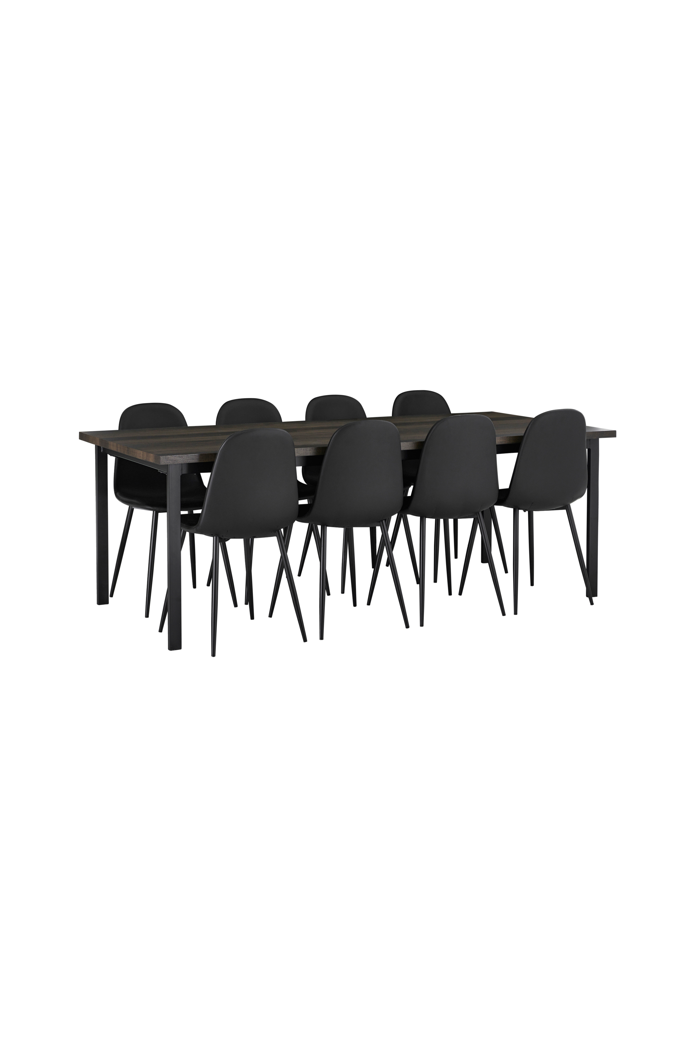 Matgrupp med ett bord och åtta stolar. Bordet har pulverlackade metallben och en toppskiva i folierad MDF.