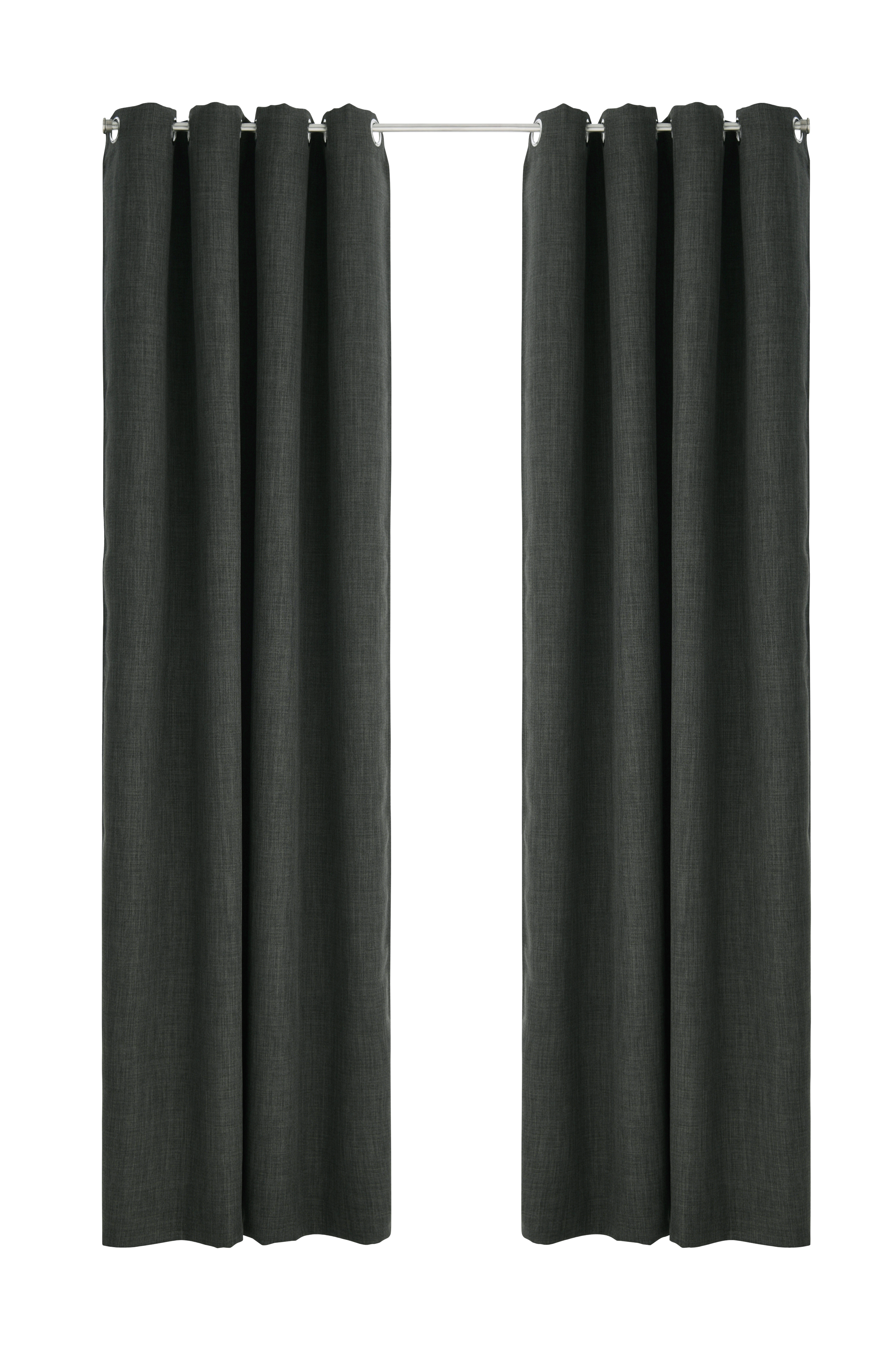 Mörkläggande gardin i linnelook med struktur och melerad effekt. Öljetter i silverfärgad metall. Ett vävt mellanlager med invävda svarta trådar gör att gardinen skärmar av ljuset. Matchande färg ton-i-ton på baksidan. Bredd 140 cm. 2 längder: 220 och 250 cm. Strykes fuktig på medelvärme på baksidan.