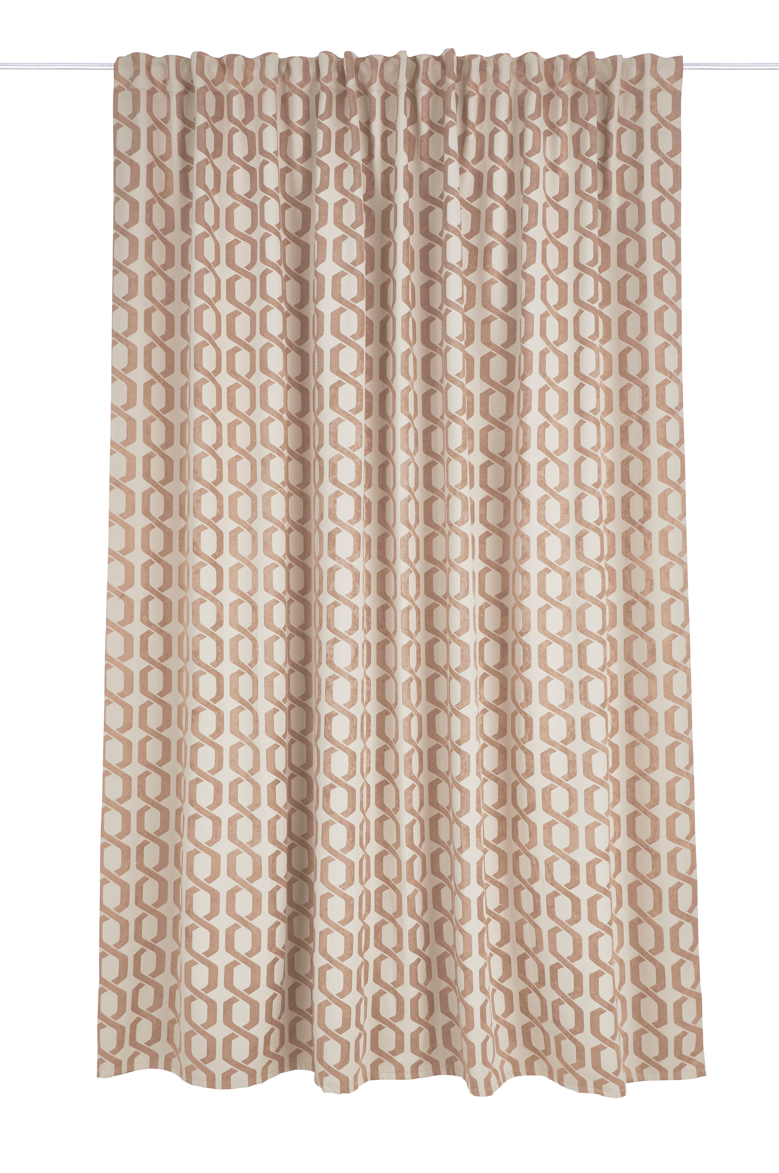 Veckbandslängd av satin med jacquardvävt mönster. Ett vävt mellanlager med invävda svarta trådar gör att gardinen skärmar av ljuset.