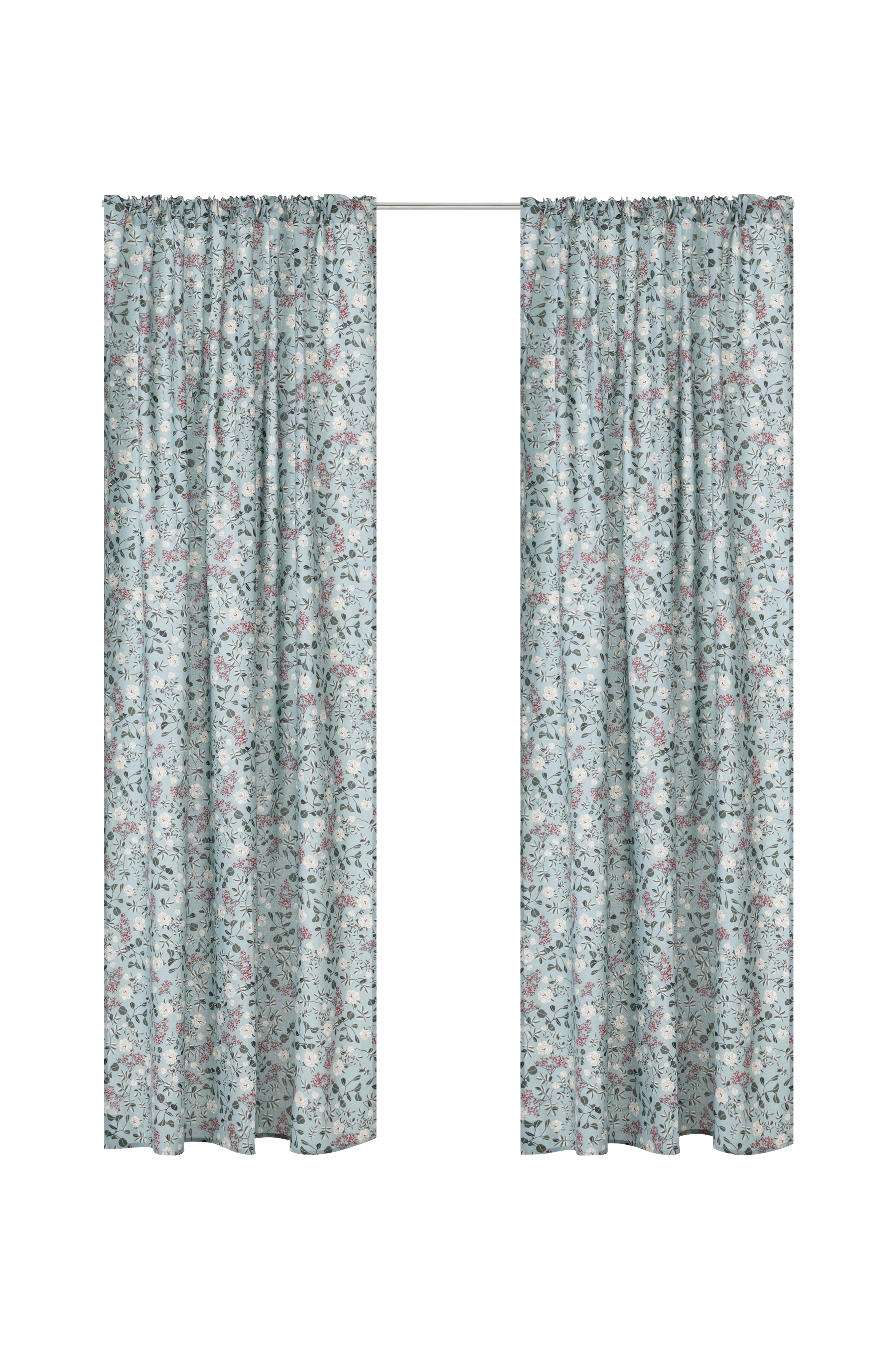 Två multibandslängder med tryckt mönster. Multibanden gör att du antingen kan hänga gardinerna direkt på en gardinstång genom de gömda hällorna eller använda ringar, nålkrokar eller fingerkrokar. Bredd 140 cm.