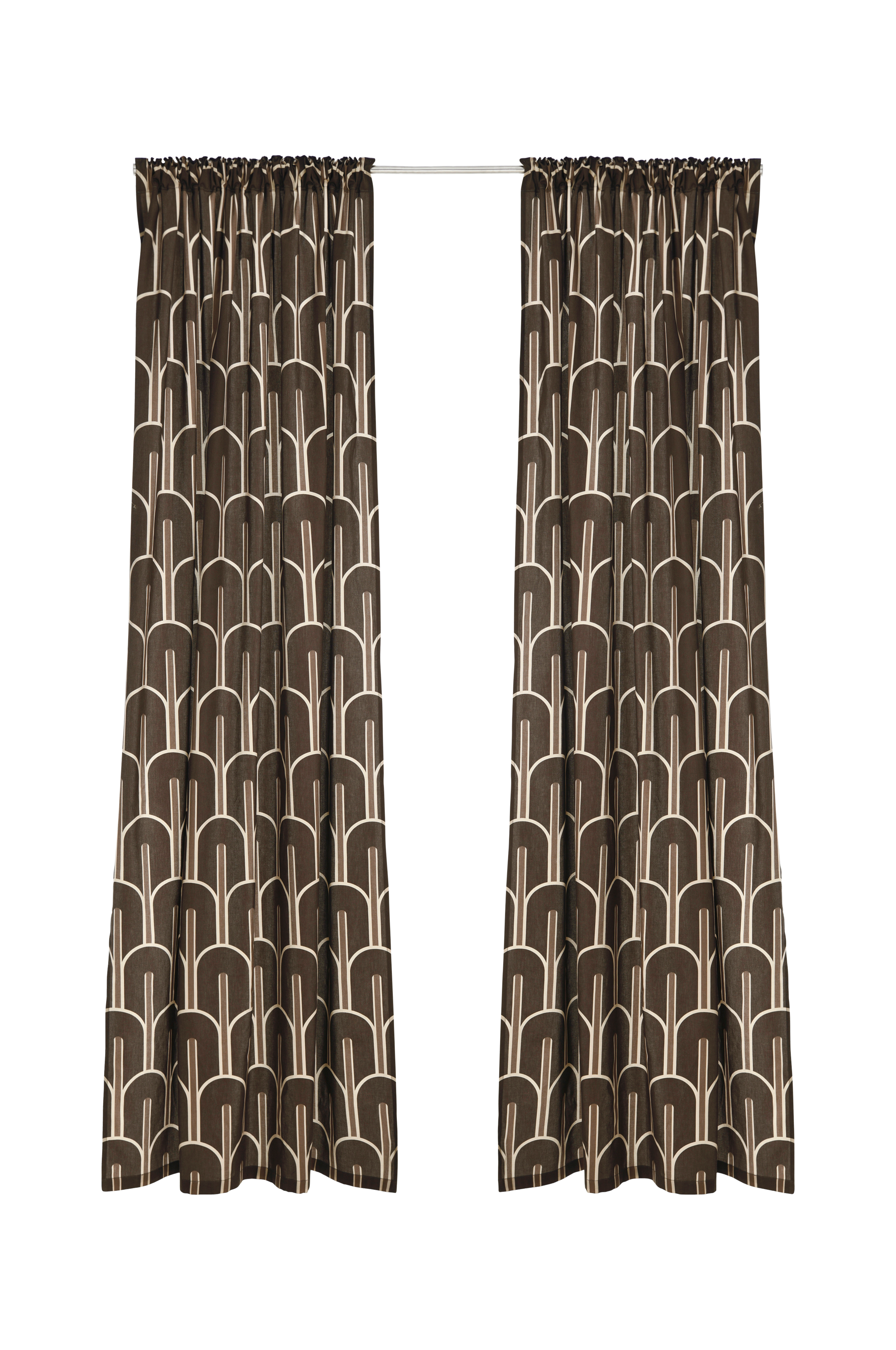 Två multibandslängder i bomullssatin med tryckt mönster och matt finish. Multibanden gör att du antingen kan hänga gardinerna direkt på en gardinstång genom hällorna eller använda ringar, nålkrokar eller fingerkrokar. Bredd 145 cm.