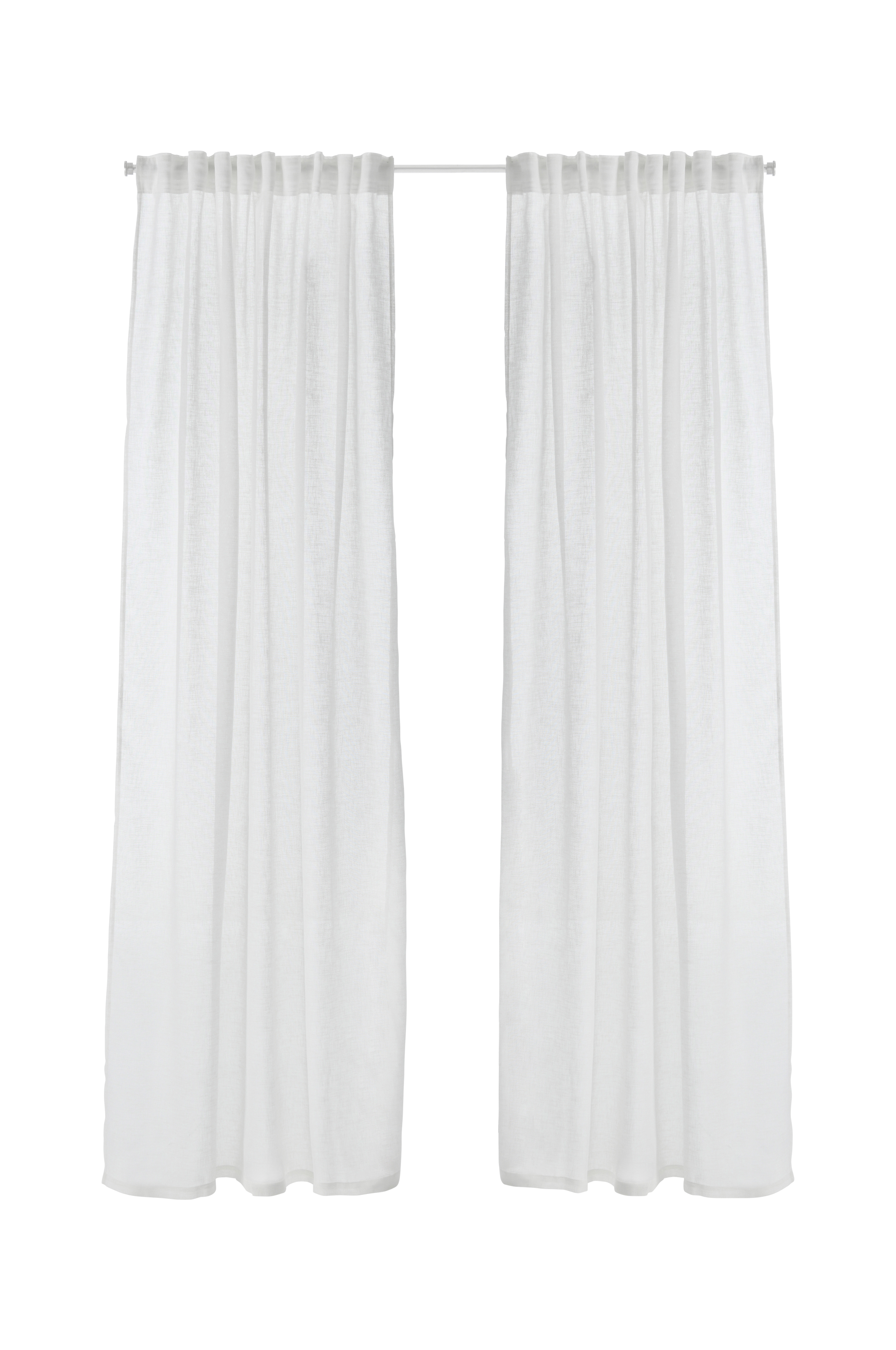 Två multibandslängder i glesvävd polyester med melangeeffekt. Multibanden gör att du antingen kan hänga gardinerna direkt på en gardinstång genom de gömda hällorna eller använda ringar, nålkrokar eller fingerkrokar. Snören i rynkbanden gör att du lätt kan skapa jämna, fina veck. Bredd 140 cm. Gardinerna finns i tre längder: 220, 250 och 300 cm.