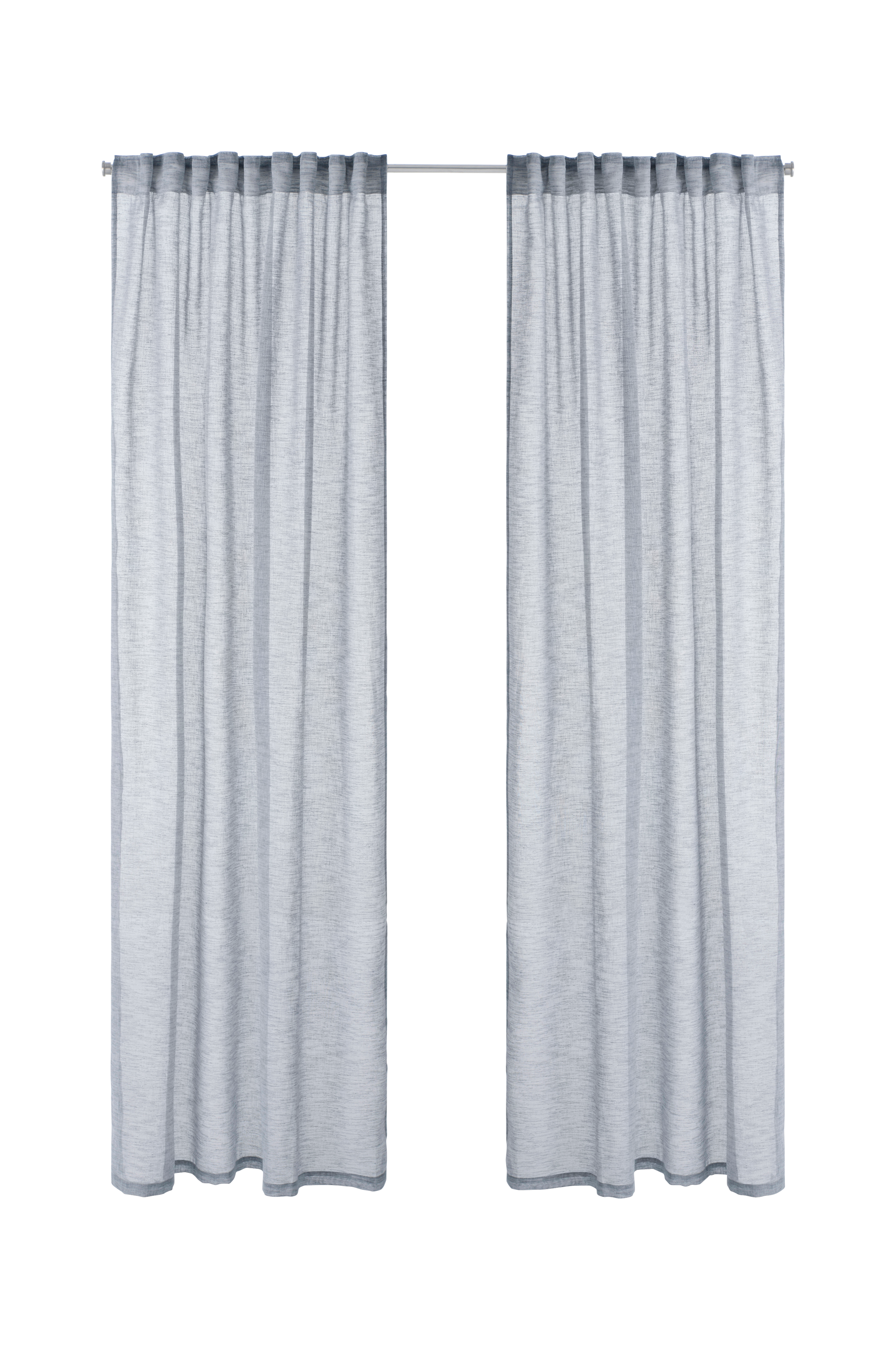 Två multibandslängder i glesvävd polyester med melangeeffekt. Multibanden gör att du antingen kan hänga gardinerna direkt på en gardinstång genom de gömda hällorna eller använda ringar, nålkrokar eller fingerkrokar. Snören i rynkbanden gör att du lätt kan skapa jämna, fina veck. Bredd 140 cm. Gardinerna finns i tre längder: 220, 250 och 300 cm.