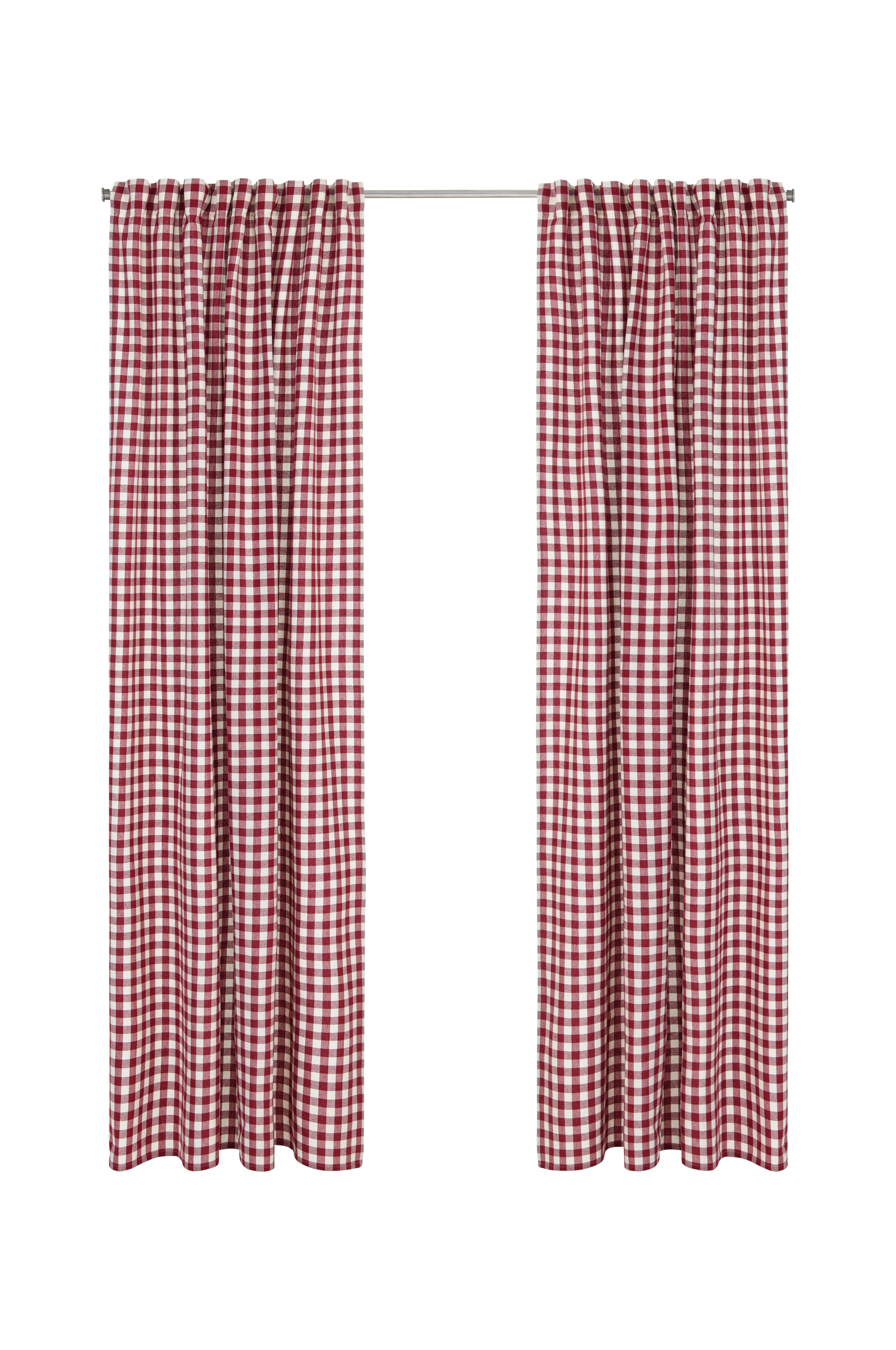 Två multibandslängder med garnfärgade rutor. Multibanden gör att du antingen kan hänga gardinerna direkt på en gardinstång genom de gömda hällorna eller använda ringar, nålkrokar eller fingerkrokar. Bredd 140 cm. Tre längder: 160, 220 och 250 cm.