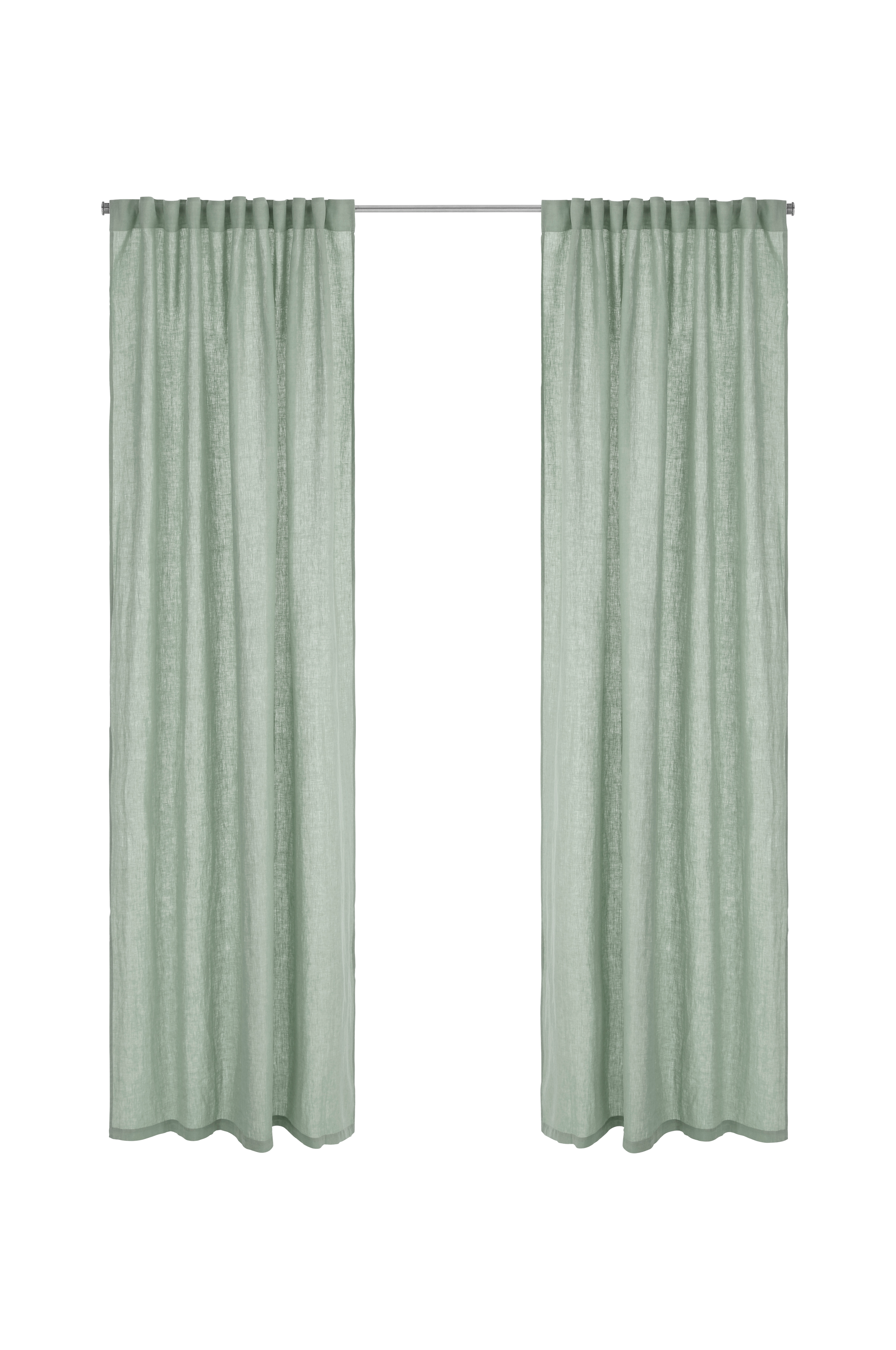Två multibandslängder i tvättat lin med vacker struktur. Multibanden gör att du antingen kan hänga gardinerna direkt på en gardinstång genom de gömda hällorna eller använda ringar, nålkrokar eller fingerkrokar. Snören i rynkbandet gör att du lätt kan skapa jämna, fina veck. Kan även användas med rynkbandskrokar. Bredd 135 cm. Finns i flera längder.