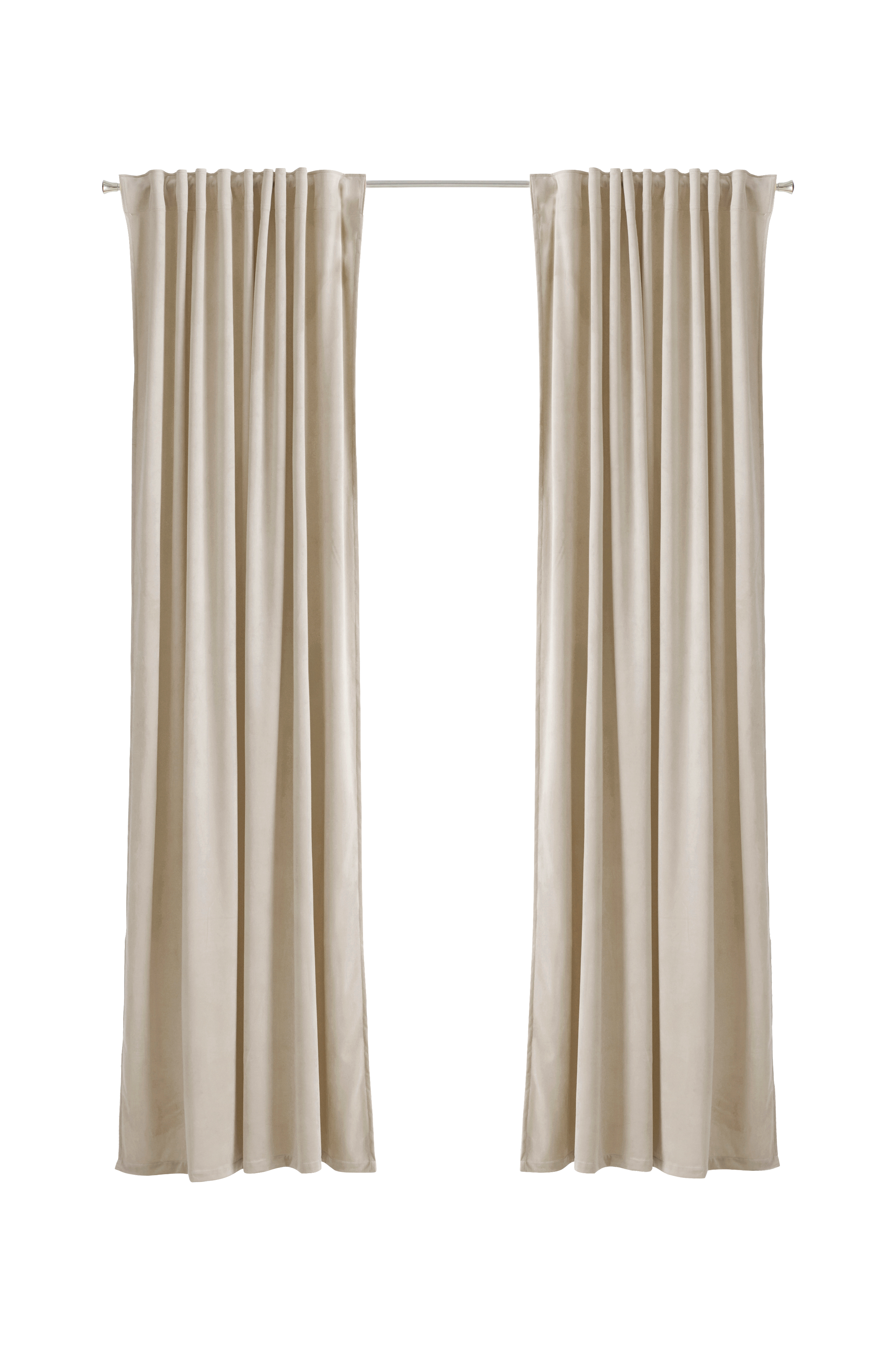 Två multibandslängder i sammet med fin lyster och mjukt fall. Multibanden gör att du antingen kan hänga gardinerna direkt på en gardinstång genom de gömda hällorna eller använda ringar, nålkrokar eller fingerkrokar. Snören i rynkbanden gör att du lätt kan skapa jämna, fina veck. Bredd 140 cm. Tre längder: 220, 250 och 300 cm.