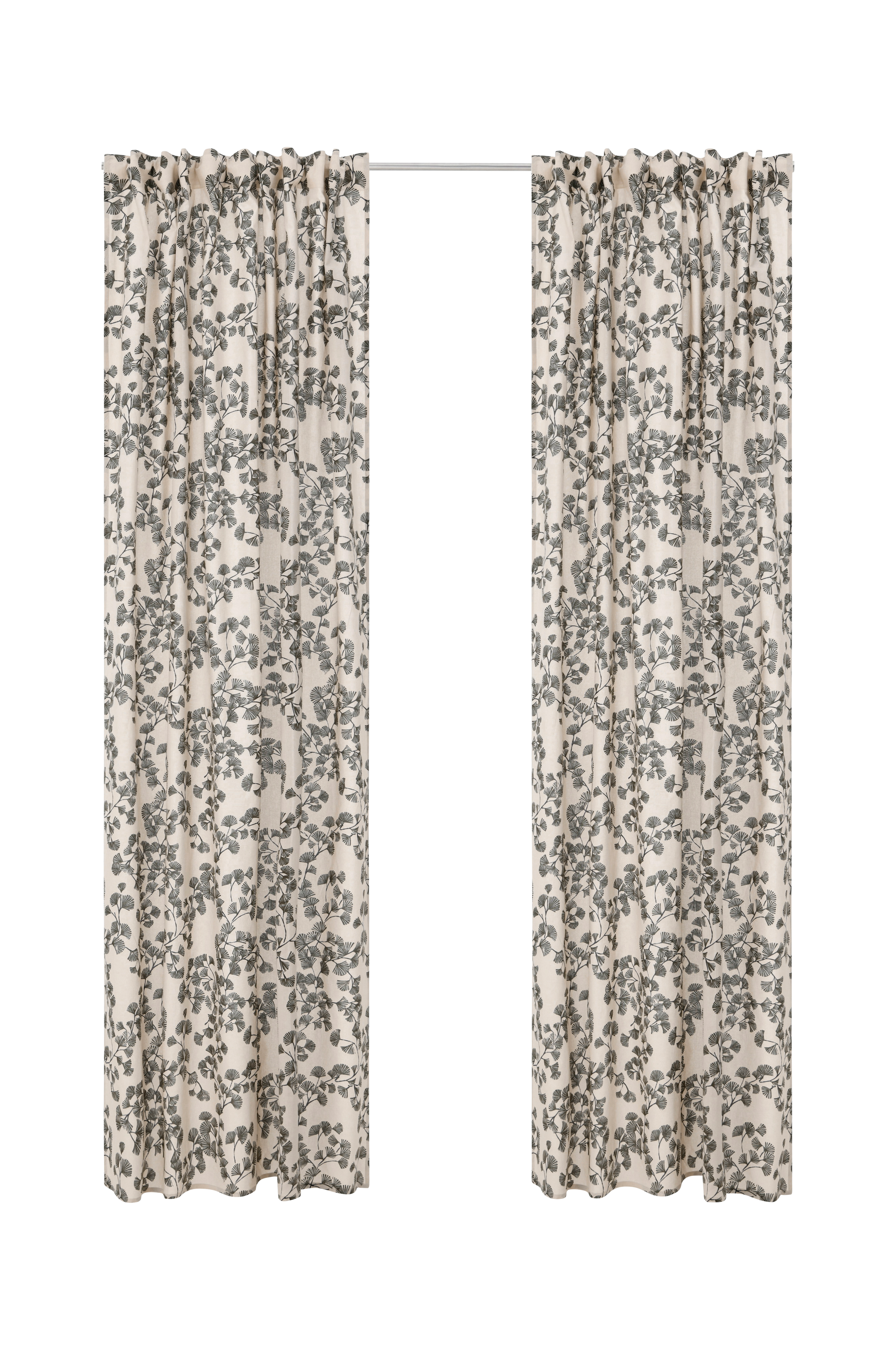 Två multibandslängder med tryckt mönster. Multibanden gör att du antingen kan hänga gardinerna direkt på en gardinstång genom de gömda hällorna eller använda ringar, nålkrokar eller fingerkrokar. Bredd 140 cm.