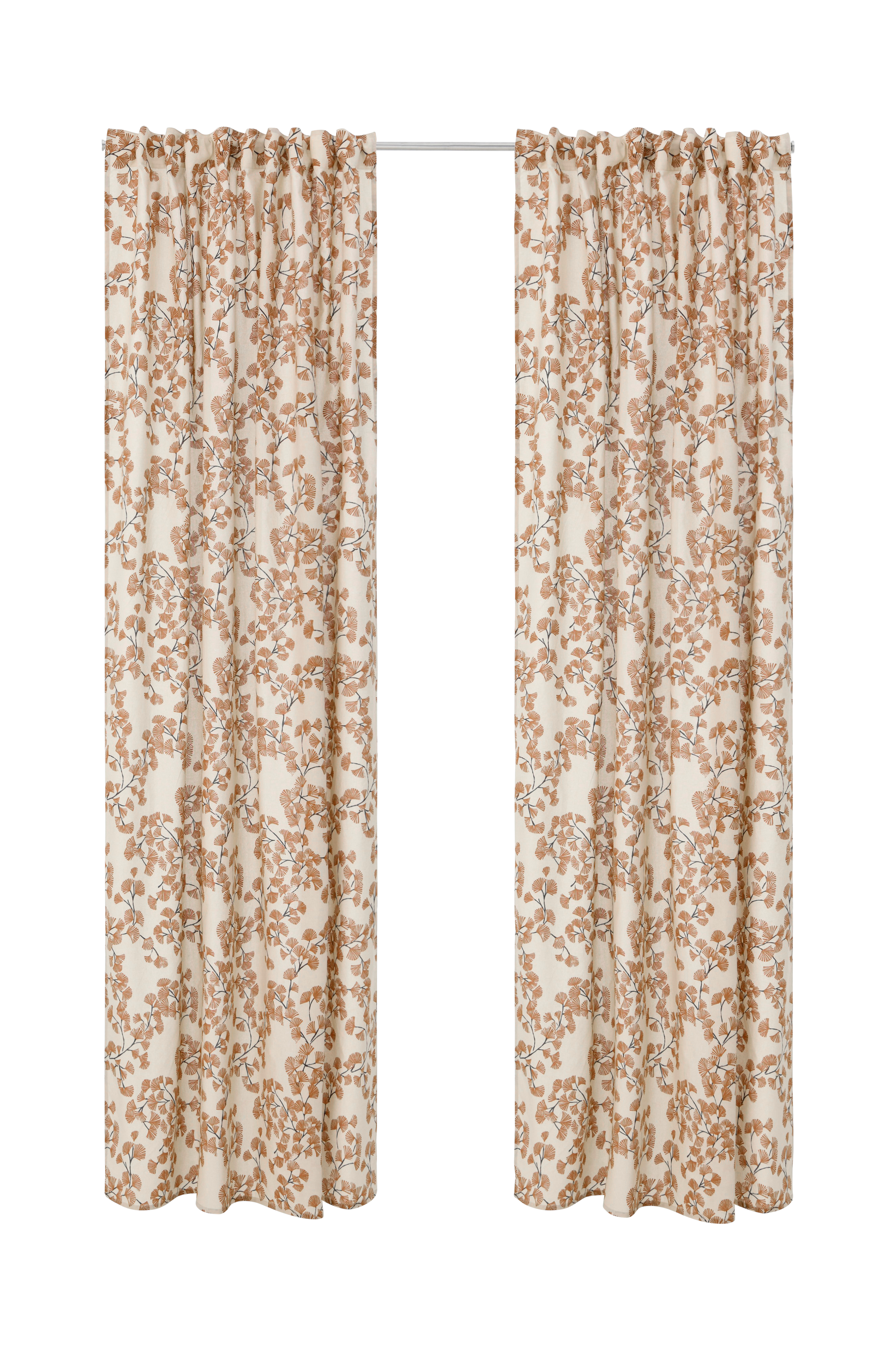 Två multibandslängder med tryckt mönster. Multibanden gör att du antingen kan hänga gardinerna direkt på en gardinstång genom de gömda hällorna eller använda ringar, nålkrokar eller fingerkrokar. Bredd 140 cm.
