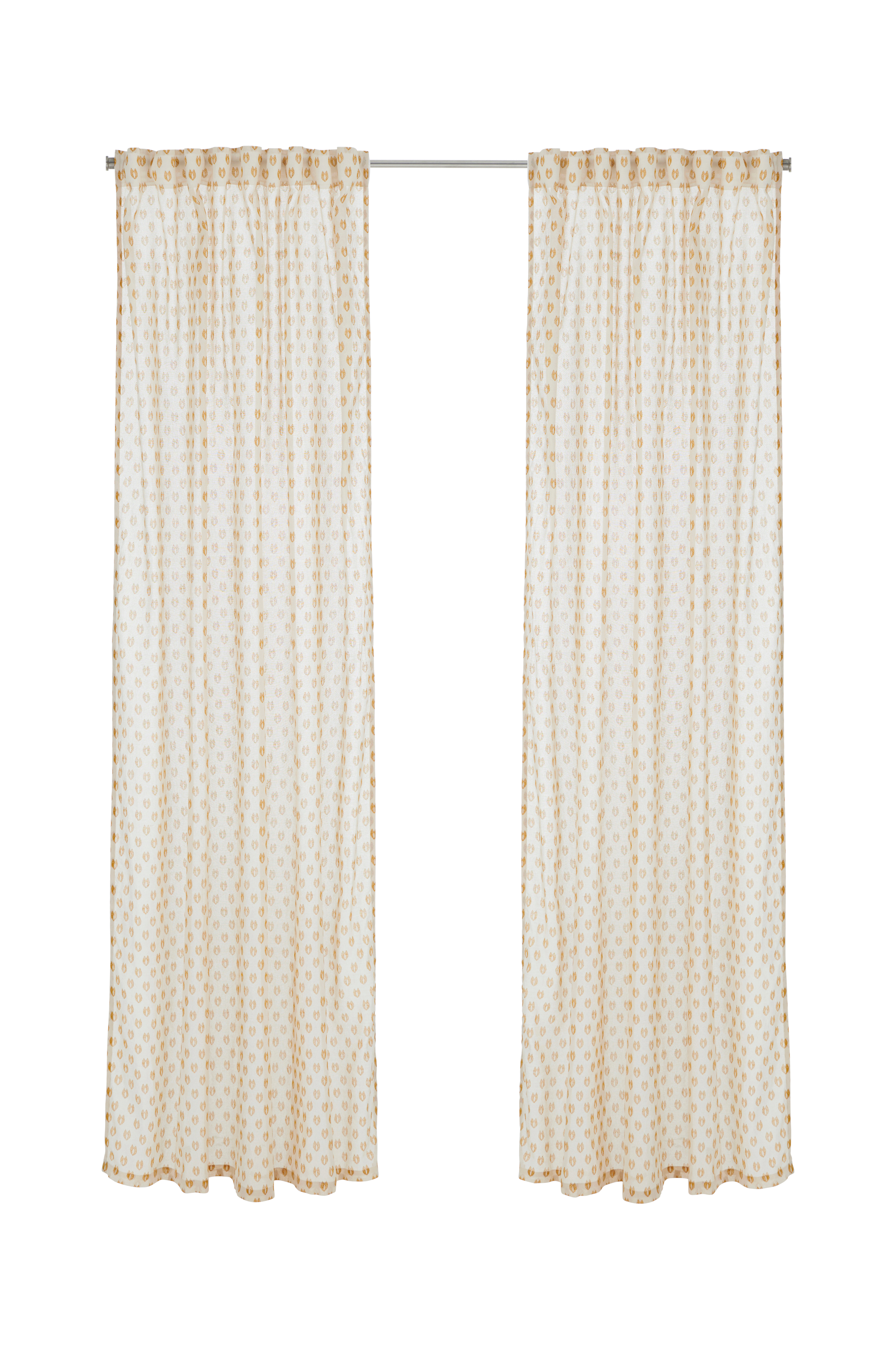 Två multibandslängder av mjuk, glesvävd bomull med tryckt mönster. Multibanden gör att du antingen kan hänga gardinerna direkt på en gardinstång genom de gömda hällorna eller använda ringar, nålkrokar eller fingerkrokar. Snören i rynkbandet gör att du lätt kan skapa jämna, fina veck.
