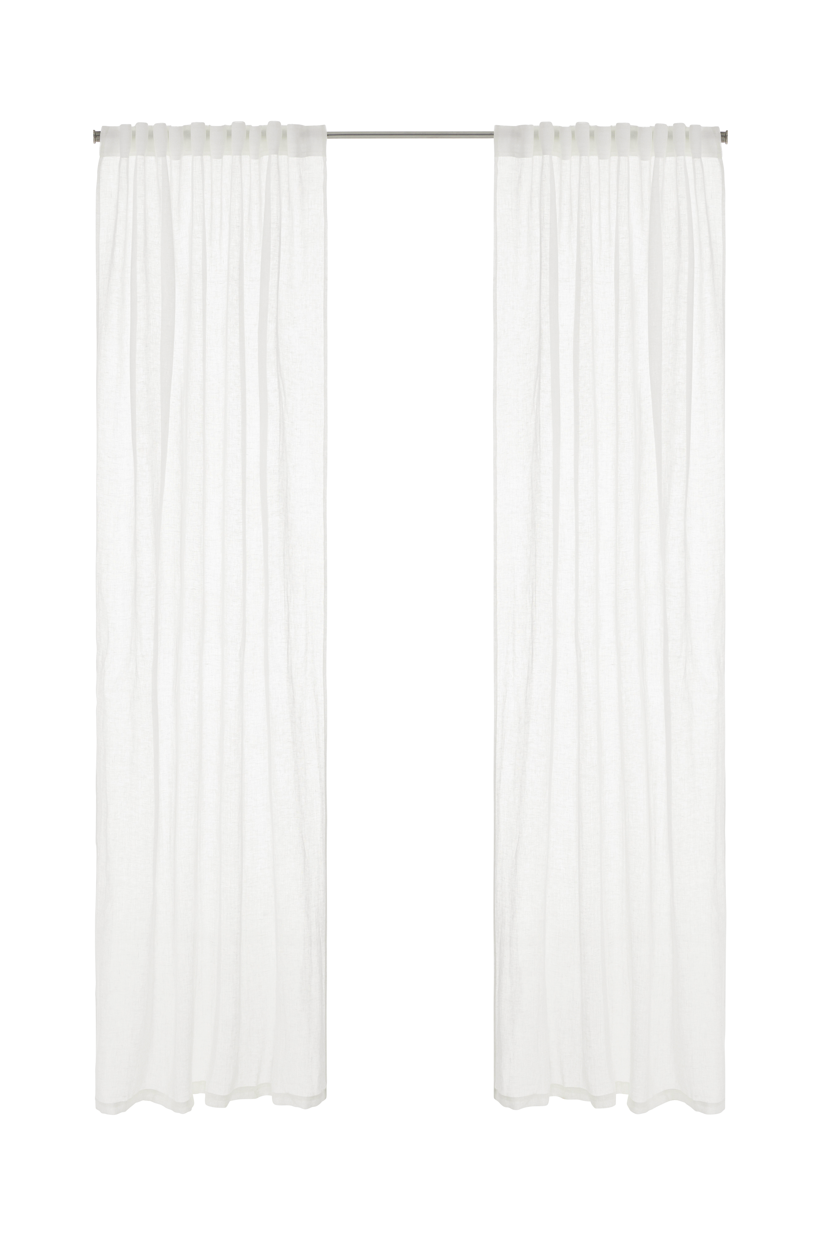 Två multibandslängder av glesvävt lin. Mjuk, skir kvalitet med melangeeffekt. Multibanden gör att du antingen kan hänga gardinerna direkt på en gardinstång genom de gömda hällorna eller använda ringar, nålkrokar eller fingerkrokar. Snören i rynkbandet gör att du lätt kan skapa jämna, fina veck.