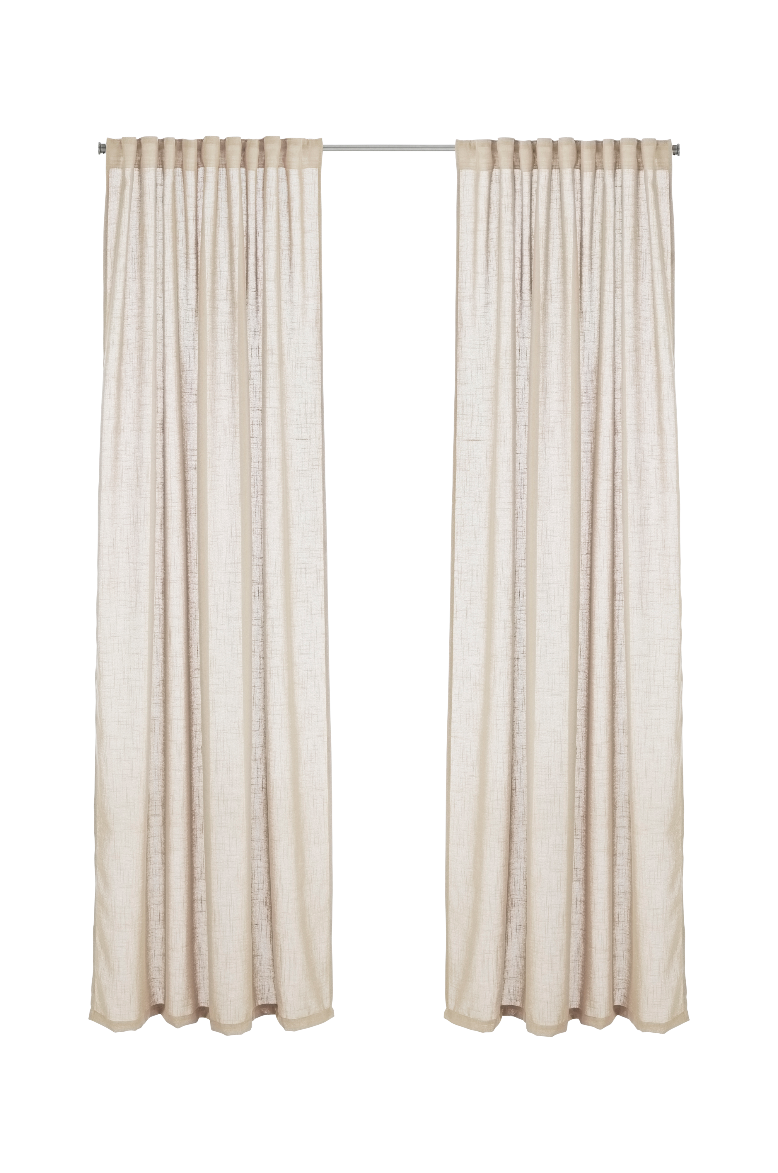 Två multibandslängder i lite grövre linnelook av mjuk, återvunnen polyester. Multibanden gör att du antingen kan hänga gardinerna direkt på en gardinstång genom de gömda hällorna eller använda ringar, nålkrokar eller fingerkrokar. Snören i rynkbandet gör att du lätt kan skapa jämna, fina veck.