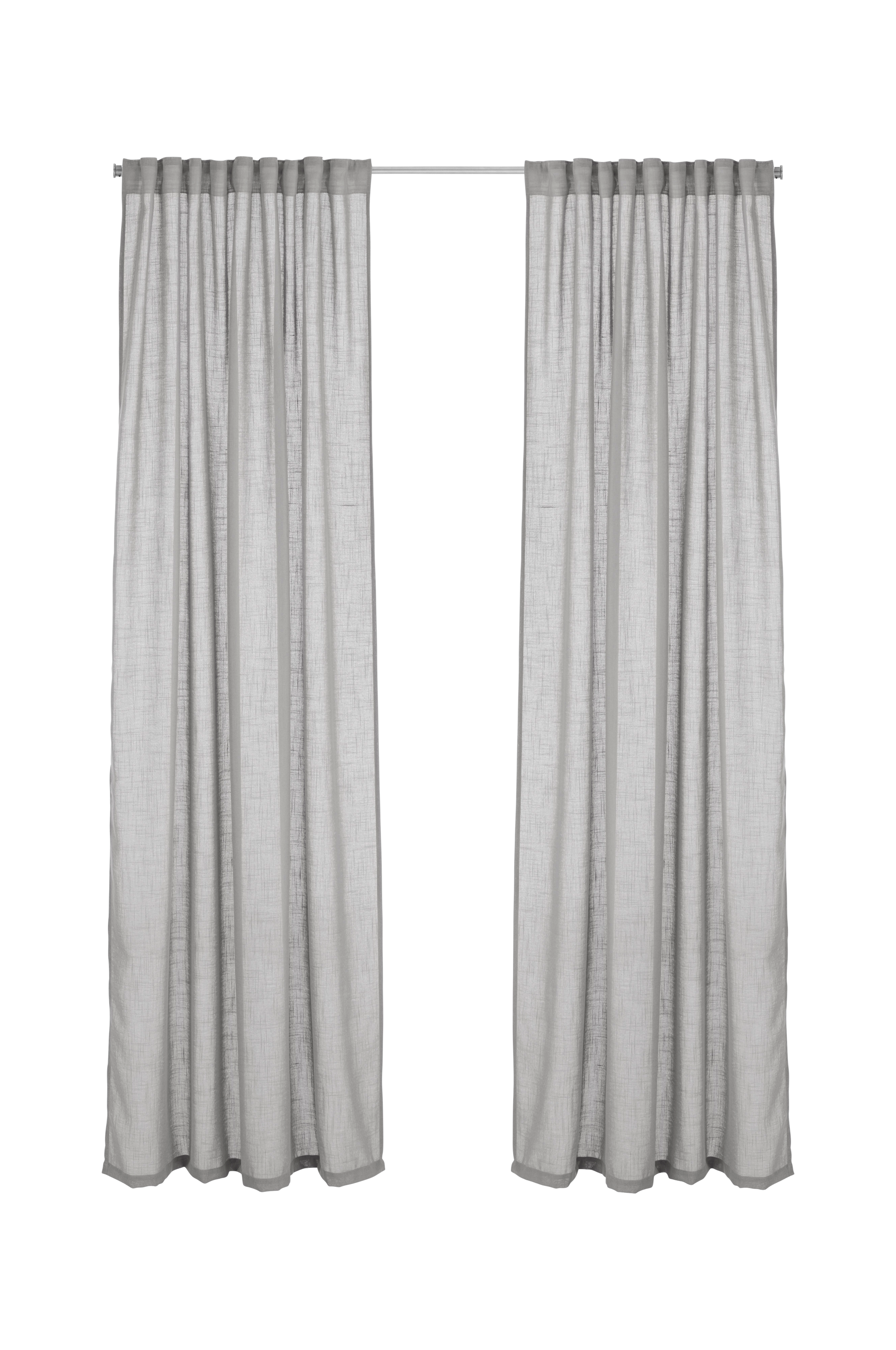 Två multibandslängder i lite grövre linnelook av mjuk, återvunnen polyester. Multibanden gör att du antingen kan hänga gardinerna direkt på en gardinstång genom de gömda hällorna eller använda ringar, nålkrokar eller fingerkrokar. Snören i rynkbandet gör att du lätt kan skapa jämna, fina veck.