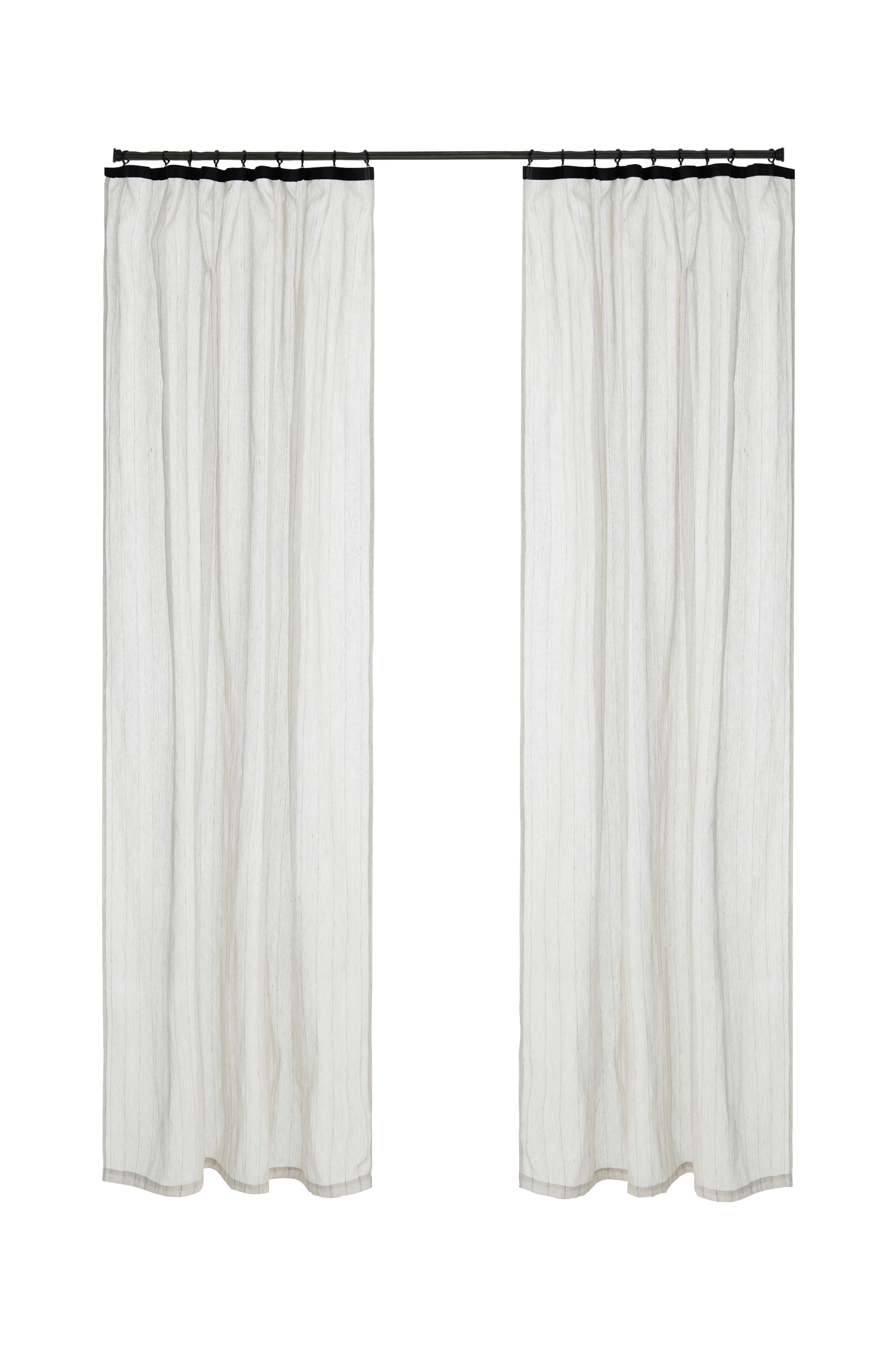 Två multibandslängder i en mix av bomull och lin med garnfärgade ränder. Smala multiband som gör att du kan använda ringar eller nålkrokar (ej fingerkrokar). Snören i banden gör att du lätt kan skapa jämna, fina veck. Bredd 135 cm. Gardinerna finns i tre längder: 220, 250 och 300 cm.