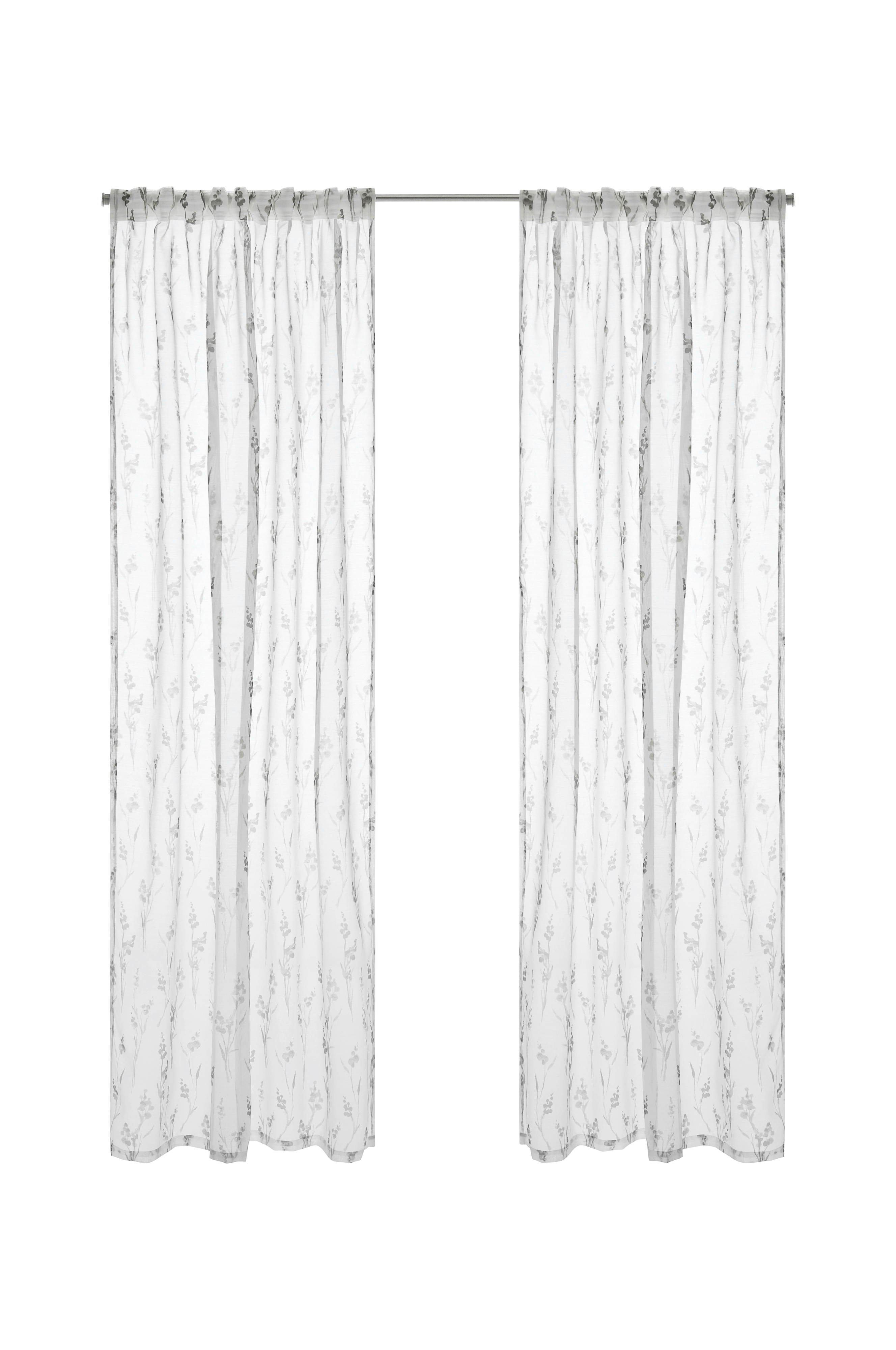 Två multibandslängder i skir, transparent kvalitet med tryckt mönster. Multibanden gör att du antingen kan hänga gardinerna direkt på en gardinstång genom de gömda hällorna eller använda ringar, nålkrokar eller fingerkrokar. Snören i rynkbanden gör att du lätt kan skapa jämna, fina veck.
