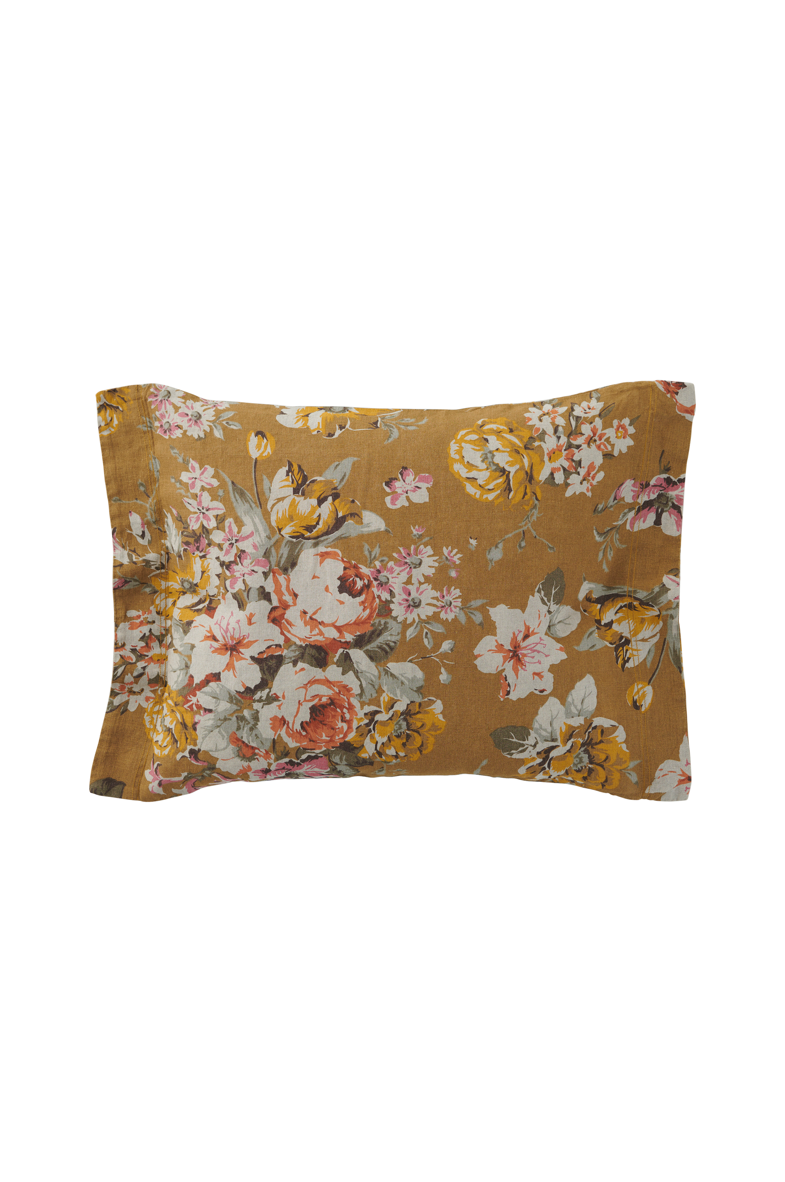 Örngott i vintagetvättad linnekvalitet av franskt lin med tryckt rosmönster på synlig linnebotten. Stl 50x60 cm + 5 cm vinge på kortsidorna.