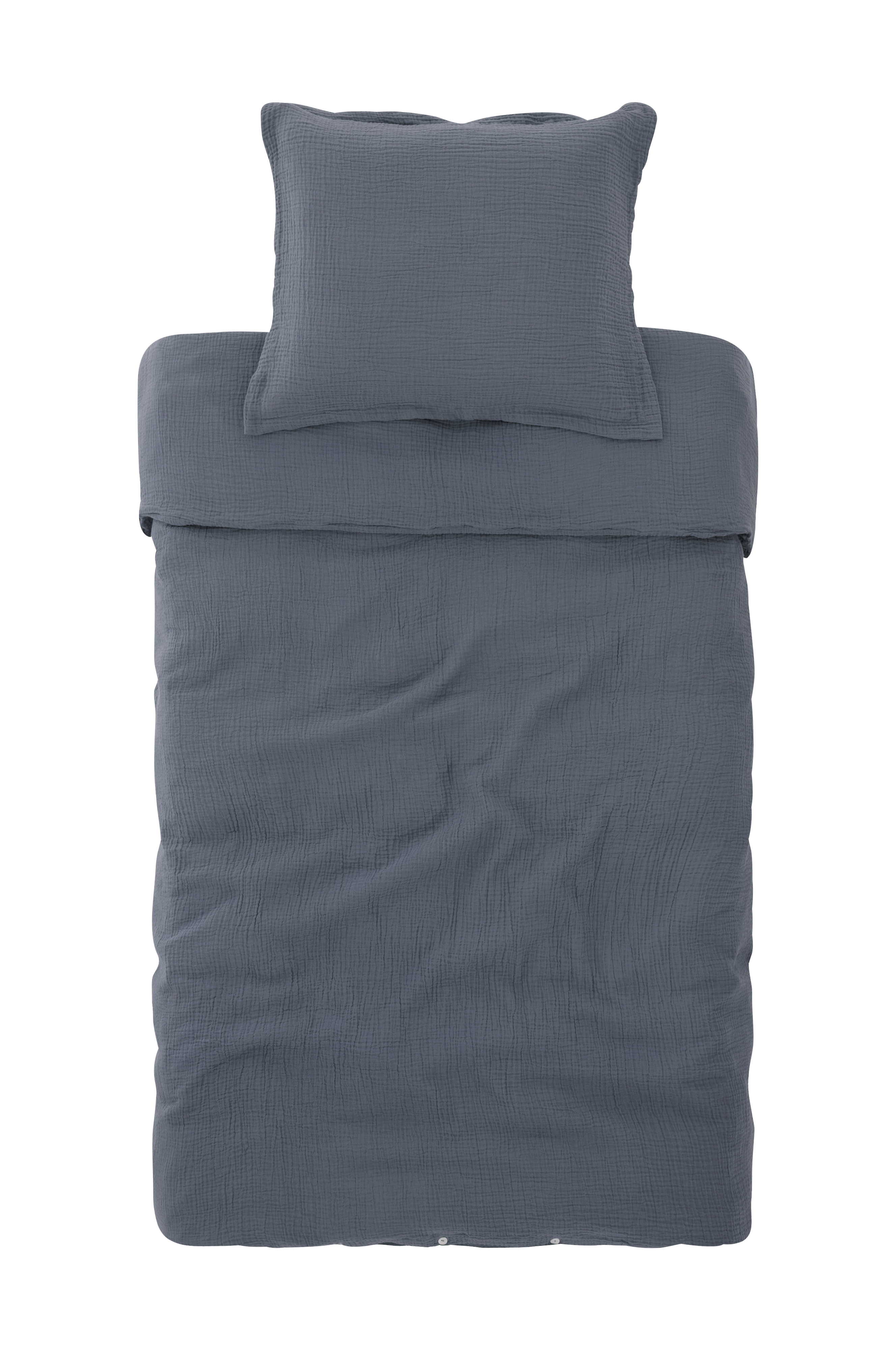 2- eller 3-dels påslakanset av tvättad, ekologisk bomullsmuslin i 2 lager. Påslakanet har knappar i nederkanten. Örngottet har 2,5 cm vinge runt om. Trådtäthet 230 TC.