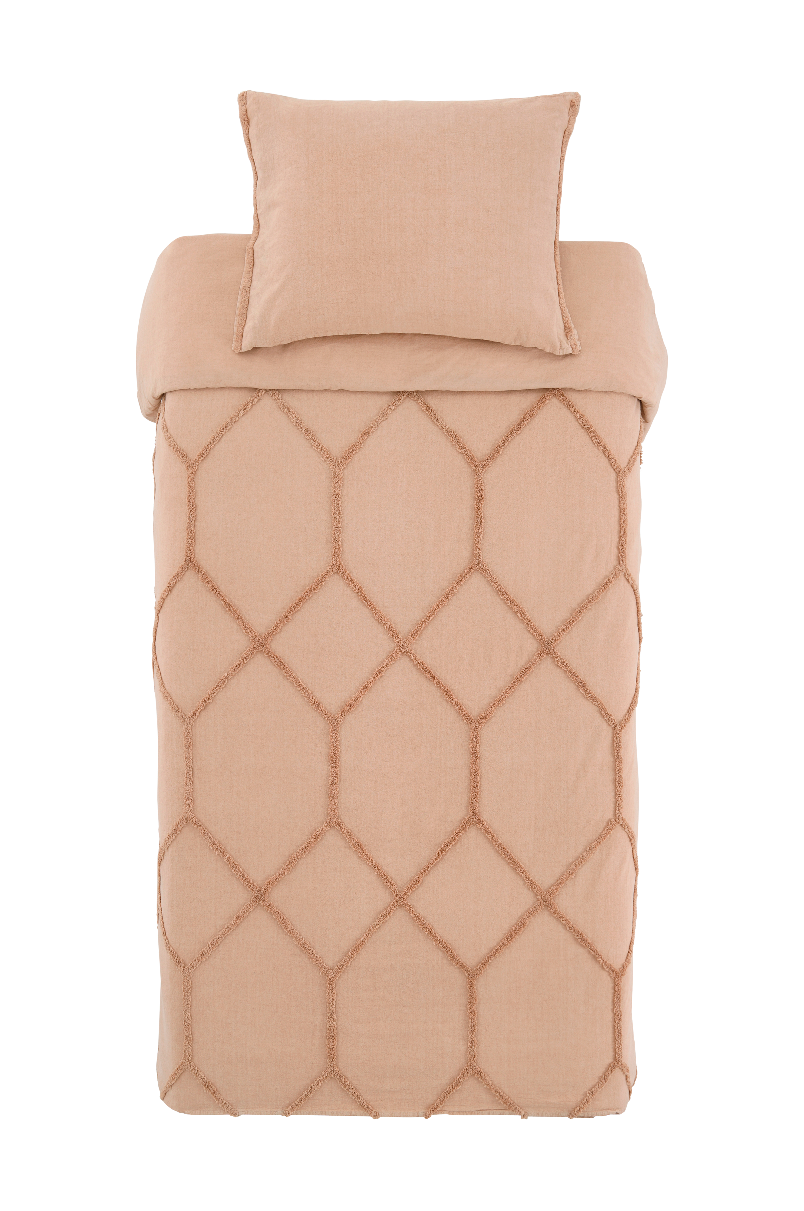 Påslakanset i ekologisk, tvättad bomull med tuftat mönster på framsidan och slät baksida. Påslakan utan handhål med tryckknappar i nederkanten. Örngott med tuftade kanter. Trådtäthet 120 TC. Levereras i tygpåse i samma kvalitet med dragskoband.