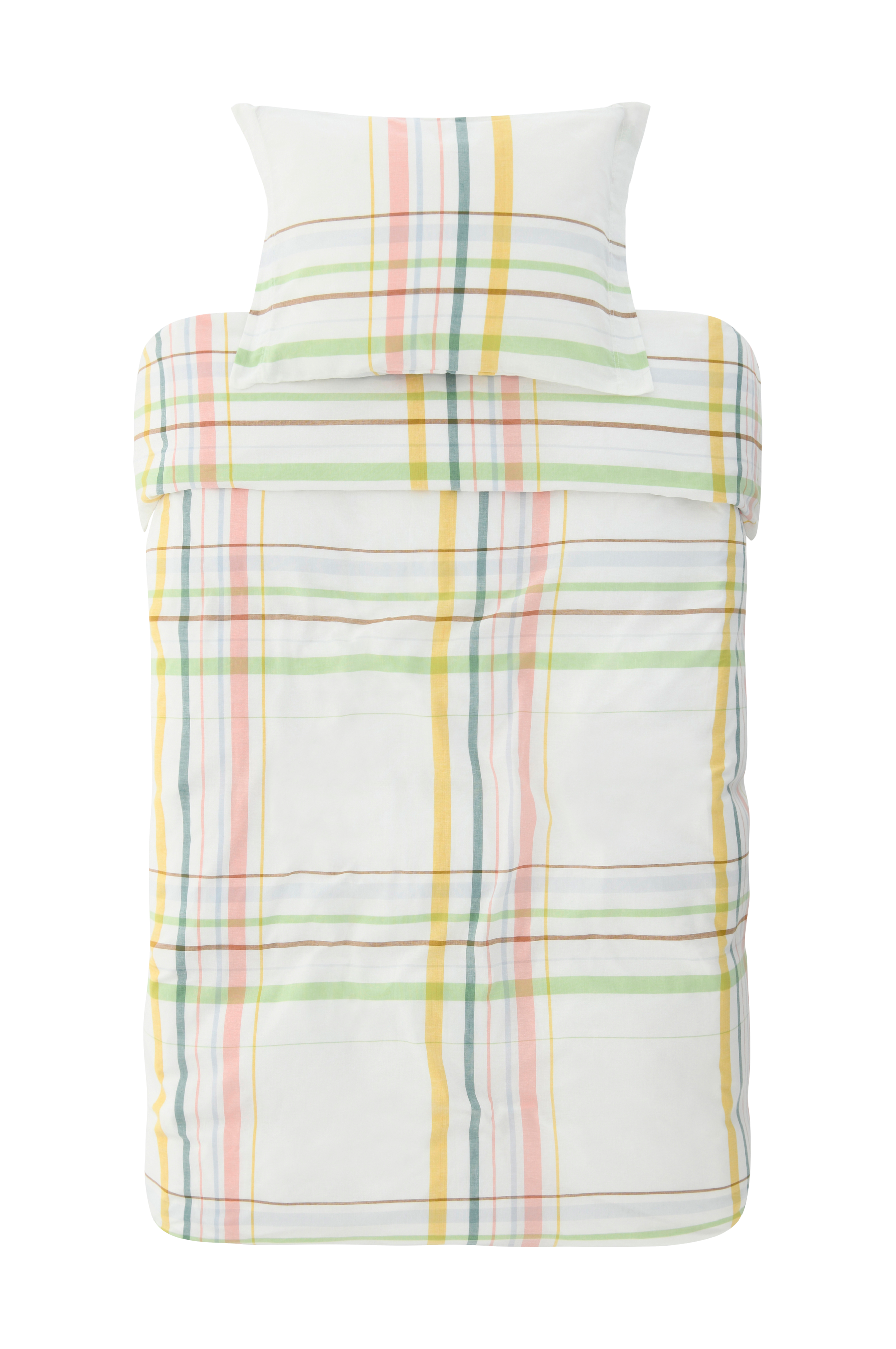 Påslakanset av följsam, mjuk ekologisk bomull med garnfärgade rutor. Trådtäthet 144 TC. Tryckknappar i nederkanten på påslakanet. Inga handhål. Setet levereras i en tygbag i samma kvalitet.