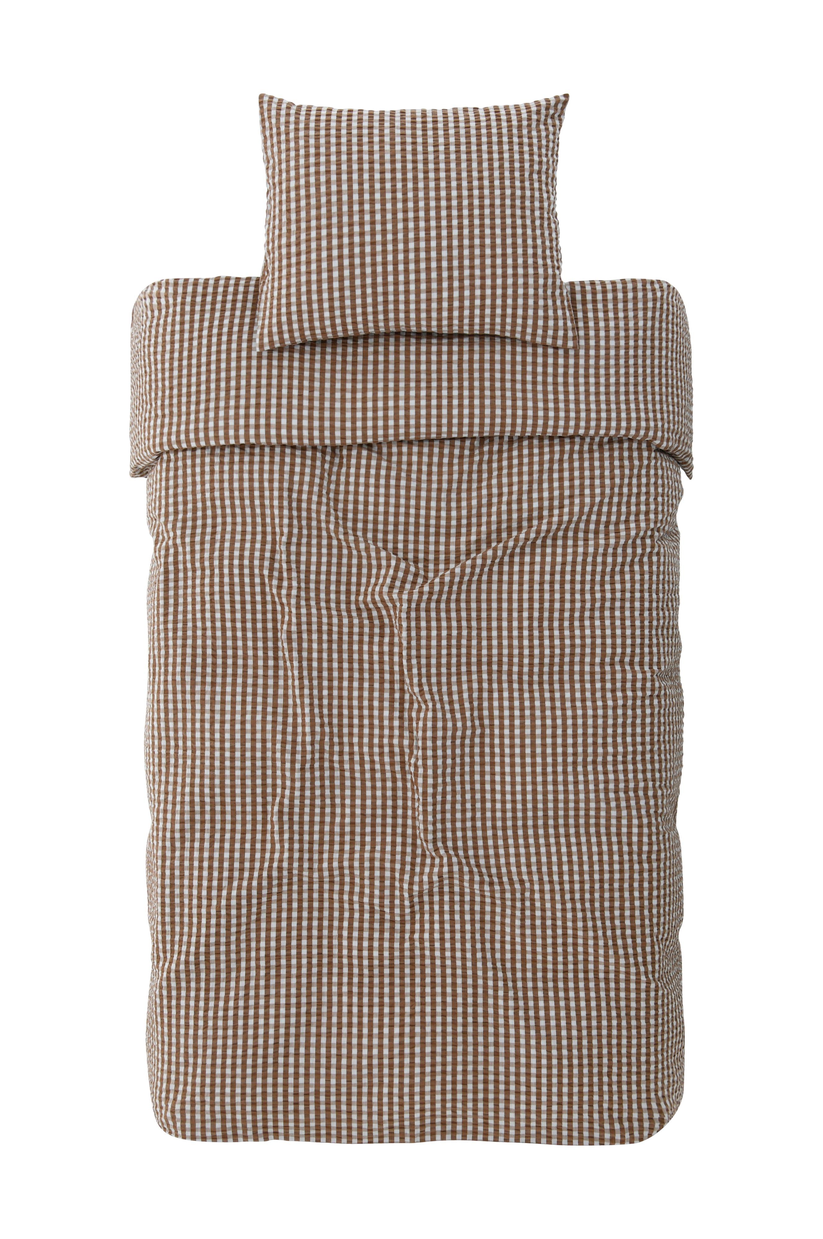Påslakanset i bäckebölja (seersucker) av kammad, ekologisk bomull. Påslakanet har tryckknappar av plast i nederkanten. Inga handhål. Setet levereras i en tygbag i samma kvalitet.