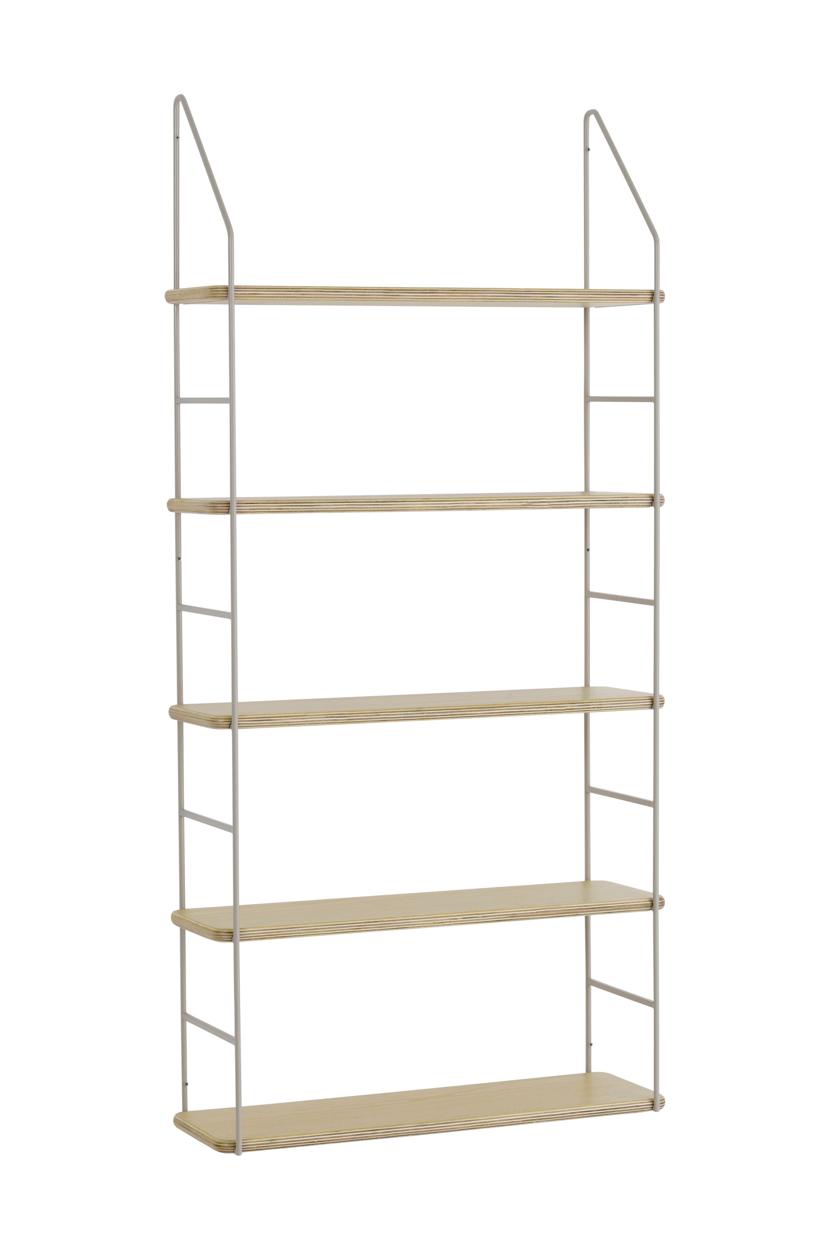 Vägghylla av pulverlackad metall med justerbara hyllplan i askfanérad plywood. Hyllan skruvas fast i väggen. Levereras omonterad.