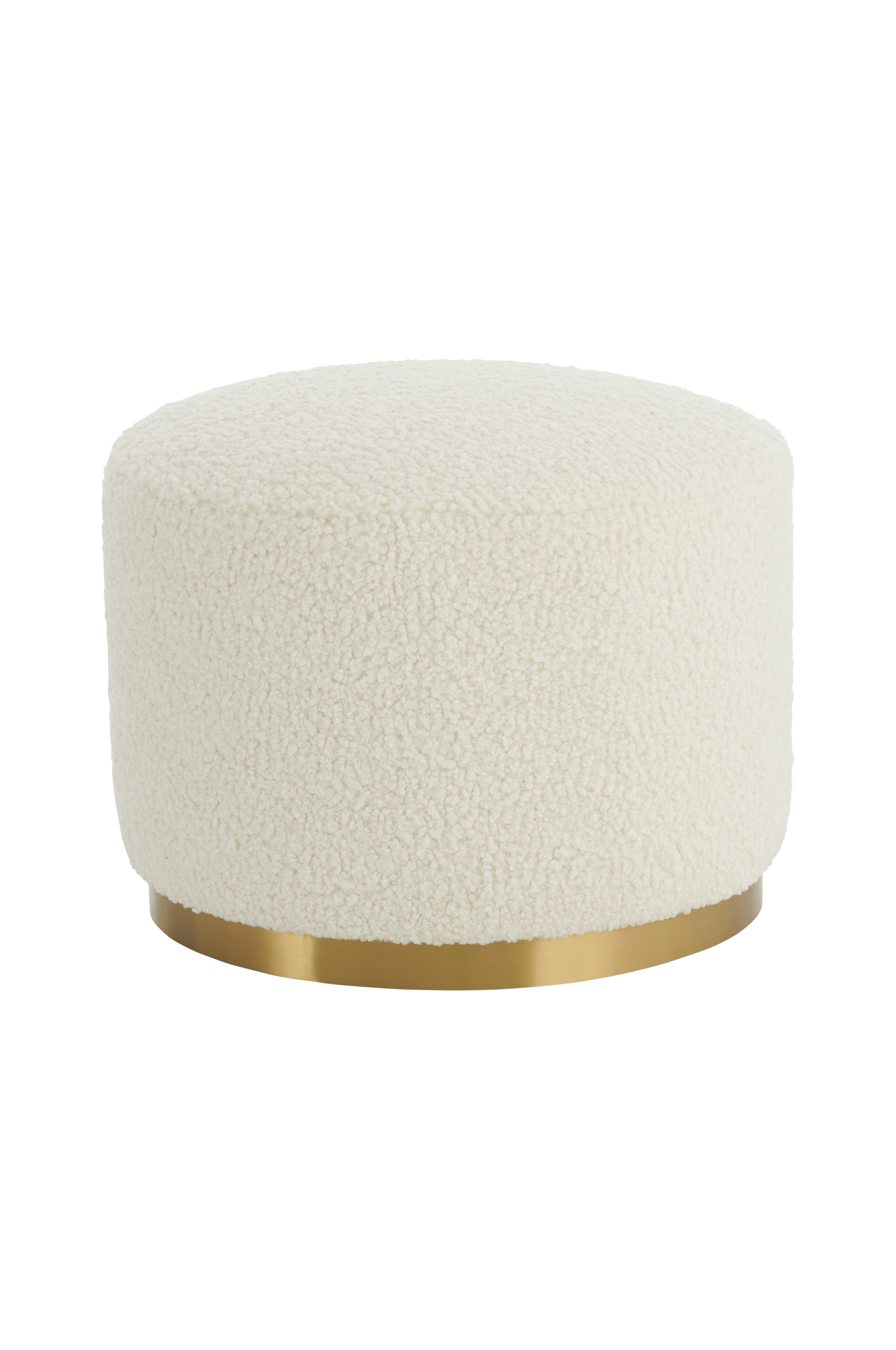 Puff / fotpall med klädsel i mjuk teddy. Stomme av massivt trä och plywood. Skumfyllning. Ram av metall med antikmässingfinish. Max viktbelastning 70 kg.