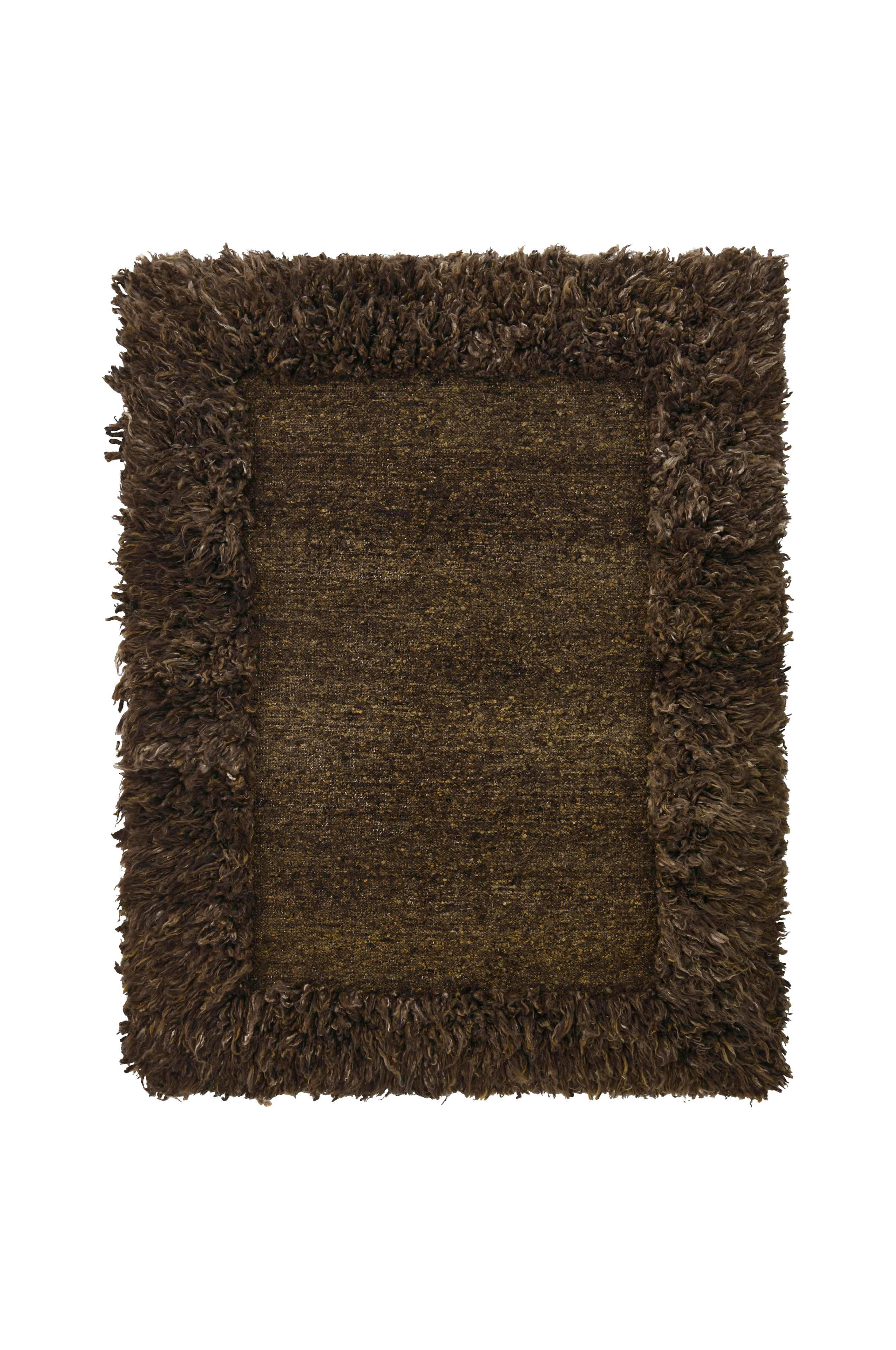 Ryamatta av ull i mycket hög kvalitet, med handspunnet och handknutet garn. Bård runt om i tjock, tvättad ull med lång lugg. Lugghöjd 9-13 cm. Boucléliknande, vävd struktur i mitten.