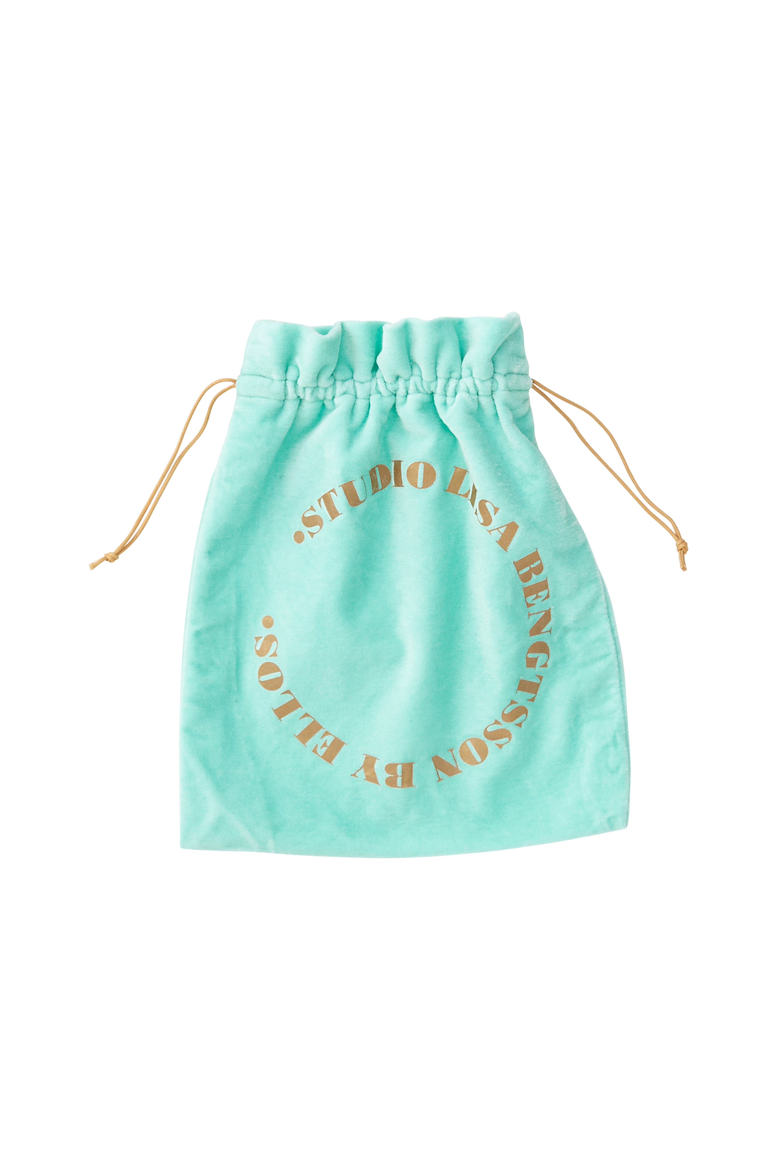 Påse i mjuktvättad sammet med texttryck i guld på ena sidan och guldfärgade dragband.