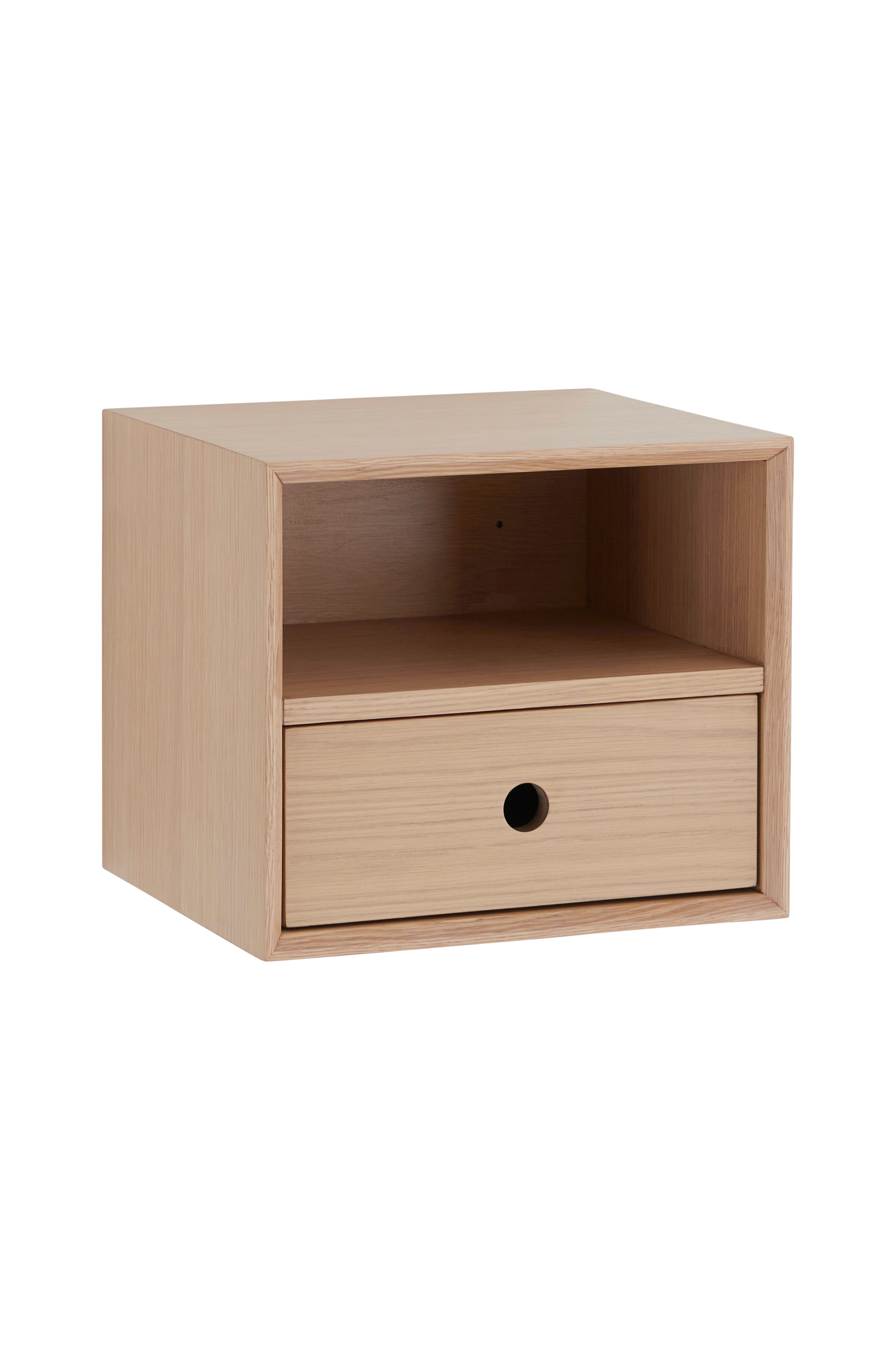 Sängbord för väggupphängning, tillverkat av MDF. Ett fast hyllplan och en låda med lådstopp. Lådans mått: B27xH13xD22 cm. Hyllans höjd 13 cm.