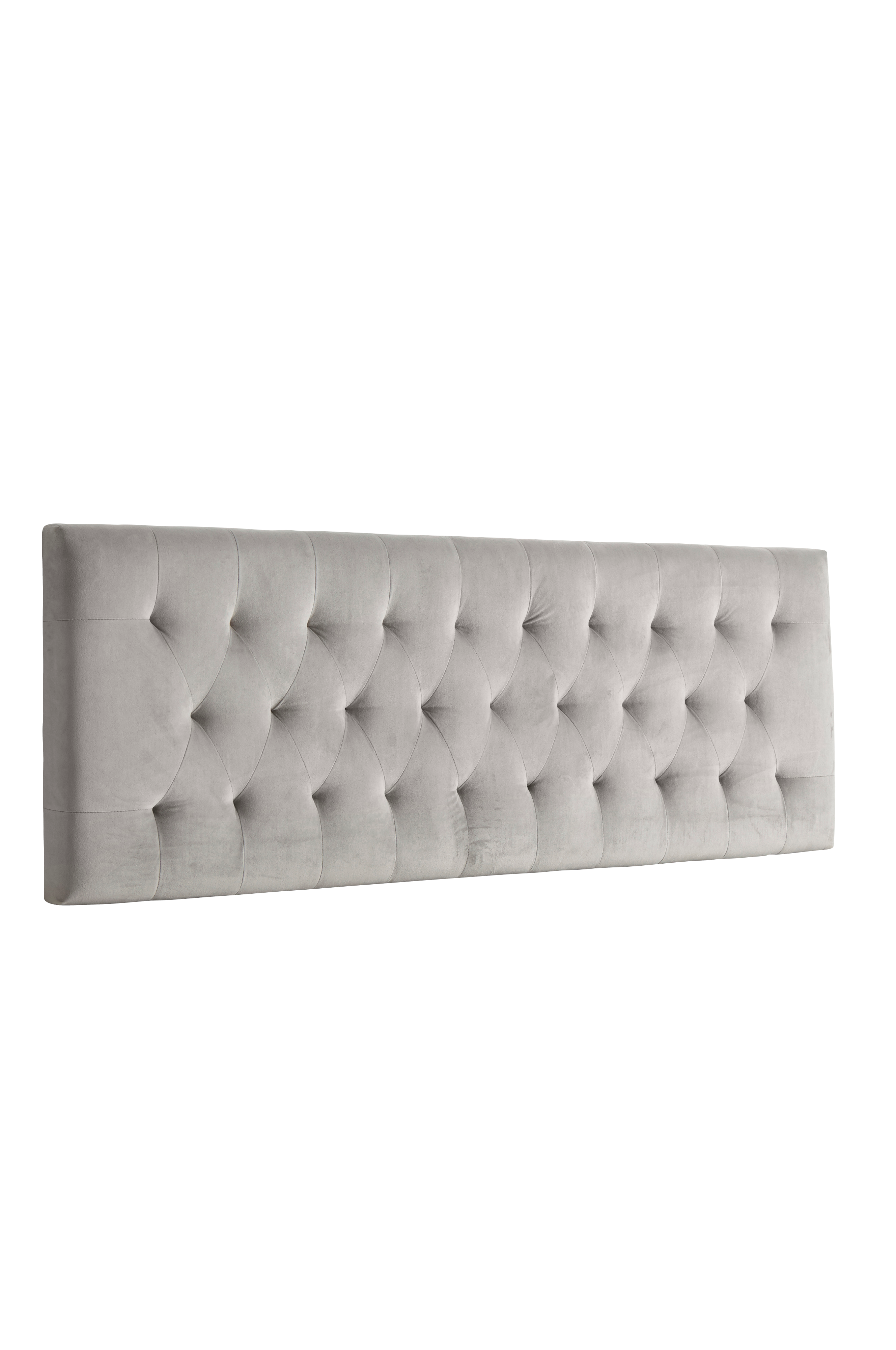 Stoppad sänggavel som fästs på väggen (väggfästen ingår). Stomme av trä. Klädsel i sammet av polyester och fyllning av polyeter. Bredd 185 cm. Höjd 60 cm. Djup 8 cm.