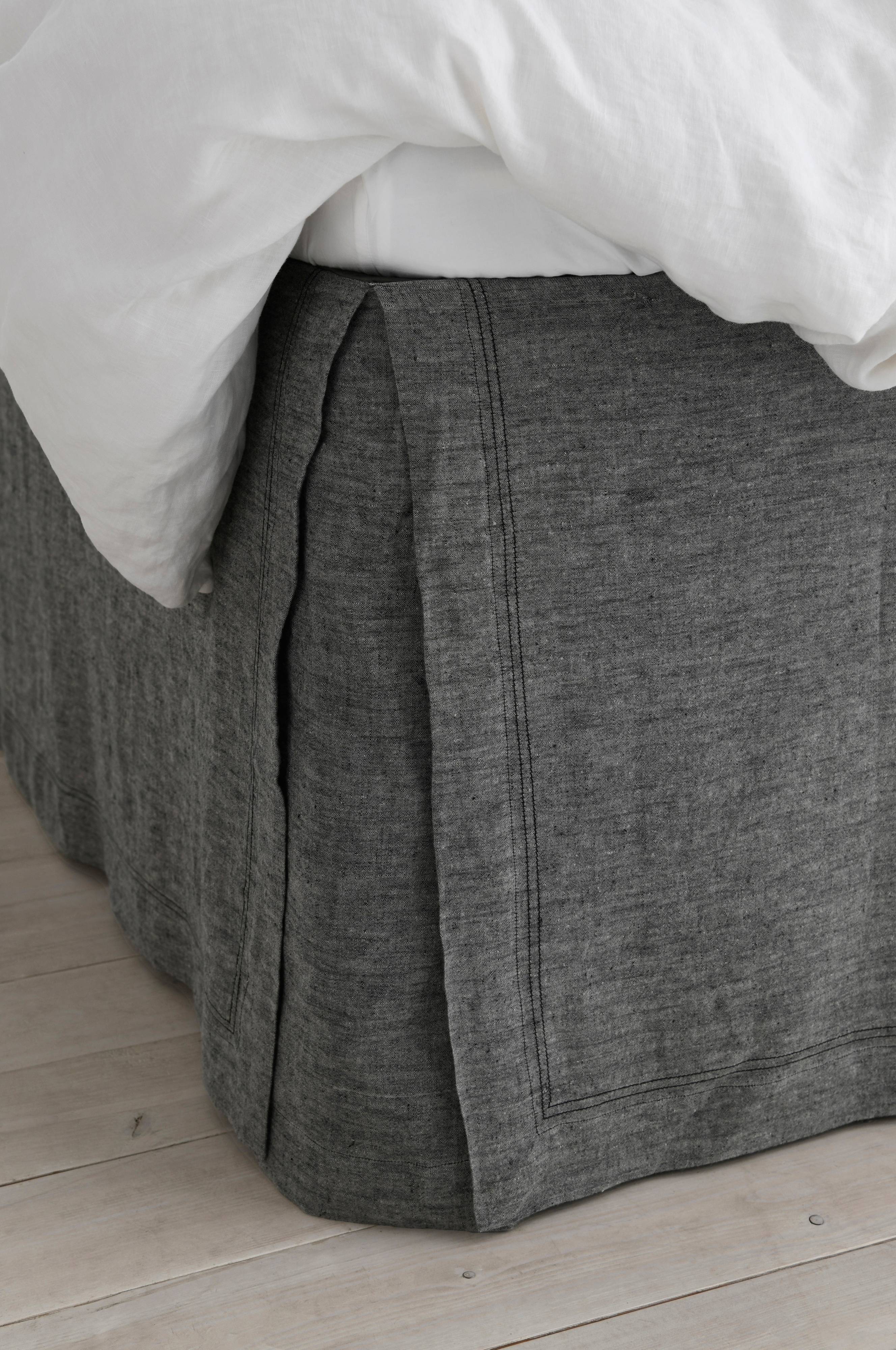 Sängkappa i tvättad och garnfärgad chambray av lin. Platta av tvättad bomull. Öppna hörn. 5 cm dubbel jeanssöm. Kappans höjd 60 cm, passar till kontinentalsäng. Finns i fyra storlekar: 90x200, 120x200, 160x200 och 180x200 cm.