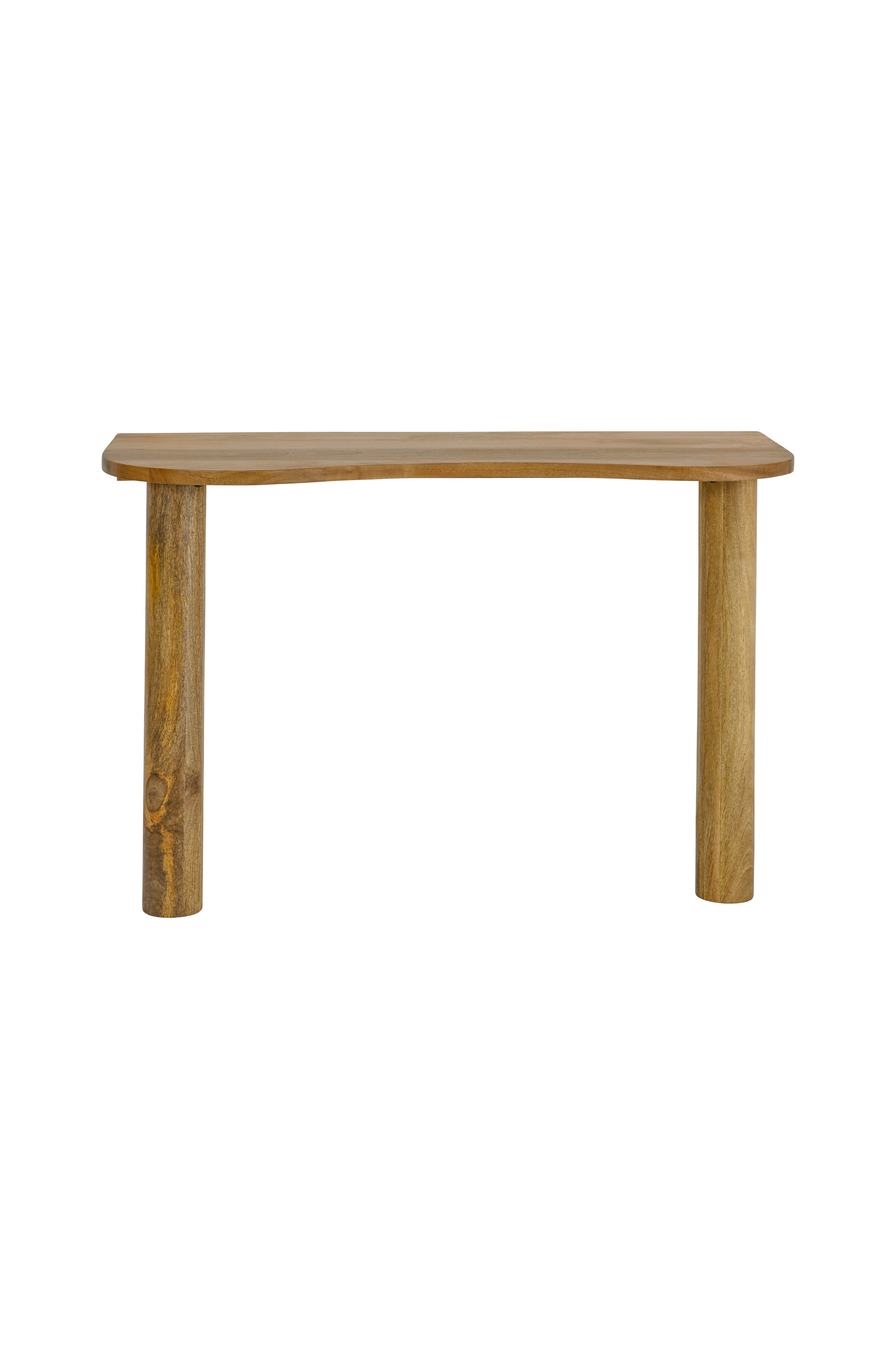 Sidobord / skrivbord i mangoträ med vaxbehandlad yta. Oregelbunden skiva med mjuk, organisk form. Fästes i vägg. Skruvhål på baksidan. Frihöjd under möbel 73 cm. Enklare montering.