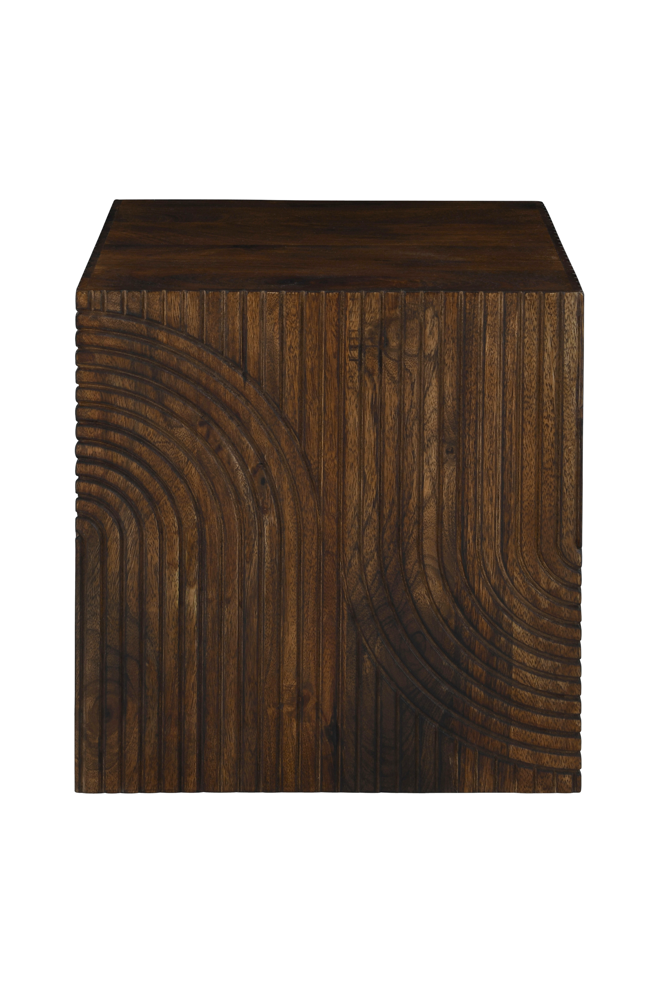 Kubformat sidobord av mangoträ med ett dekorativt, snidat strukturmönster på alla sidor. Slät topp.