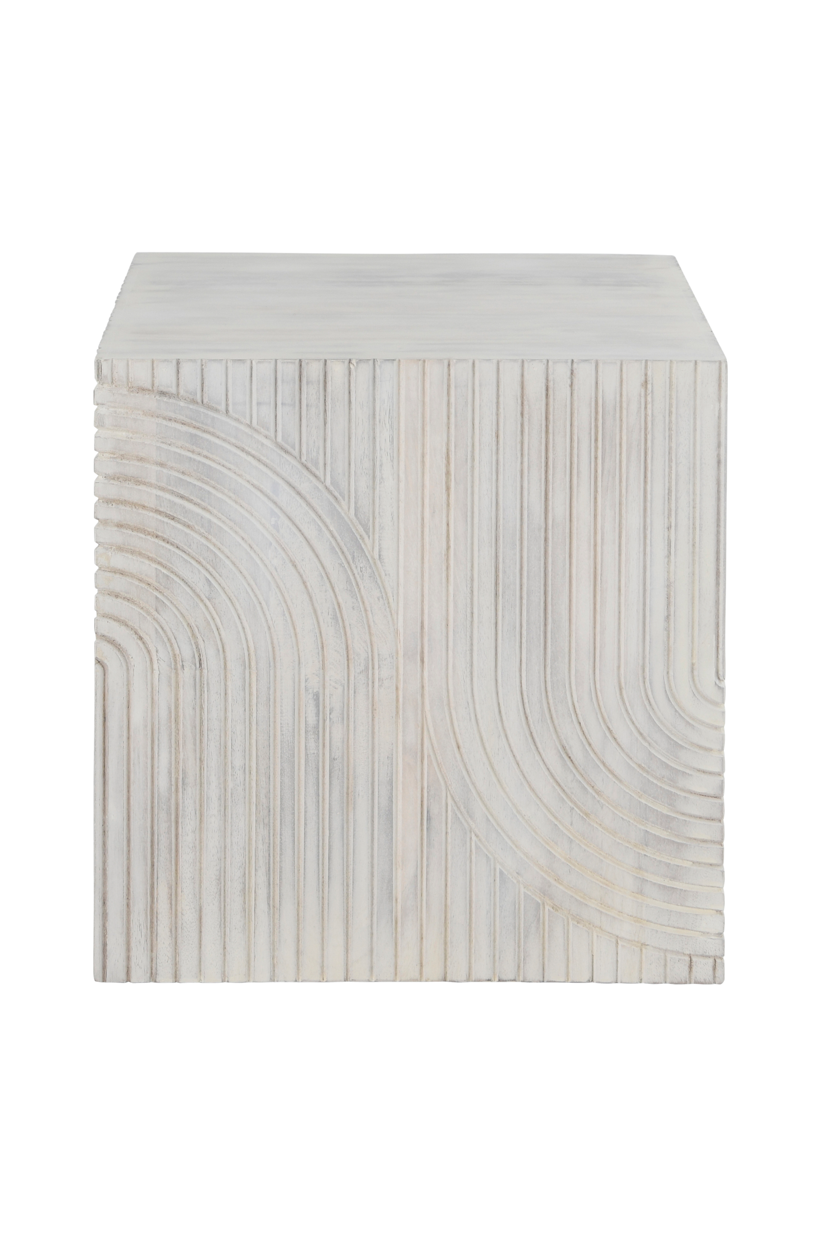 Kubformat sidobord av mangoträ med ett dekorativt, snidat strukturmönster på alla sidor. Slät topp.