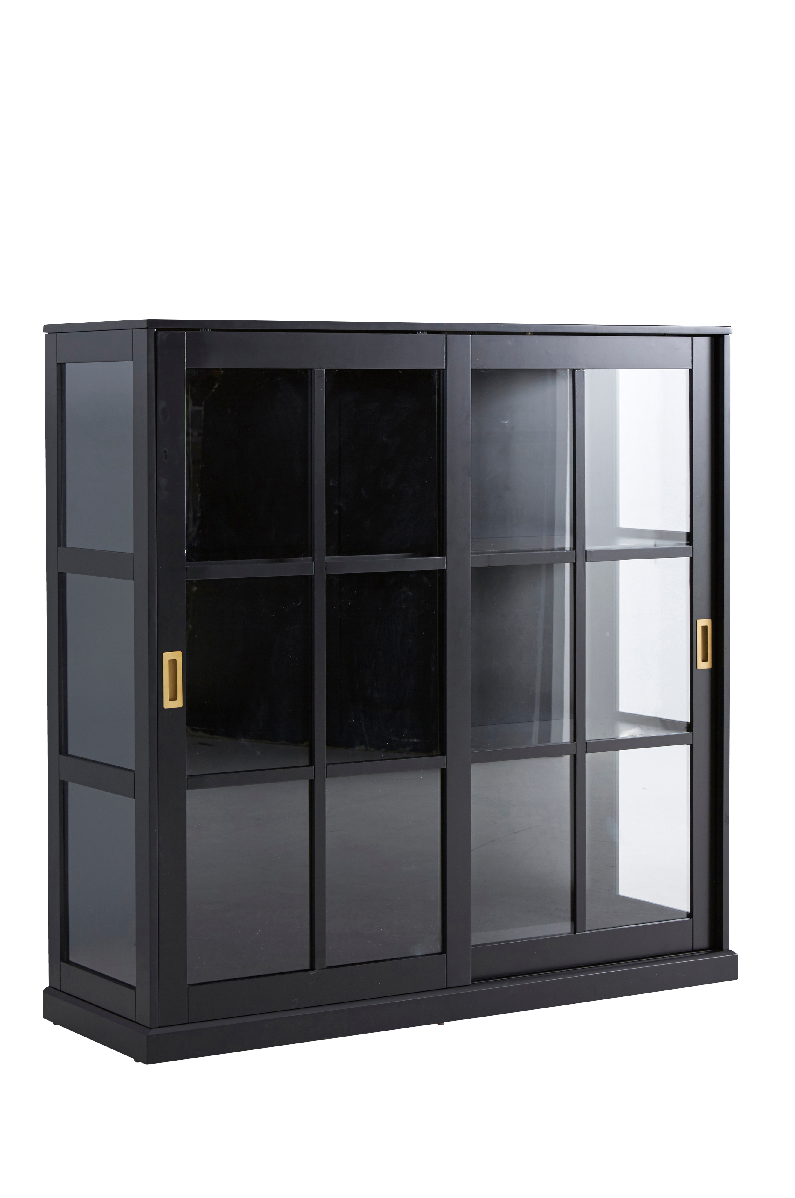 Ett gediget, rymligt skåp med många användningsområden. Av MDF med sidor och skjutdörrar av glas. Skjutdörrarna har handtag av antikmässingsfärgad metall. Två fasta hyllplan och en mellanvägg.