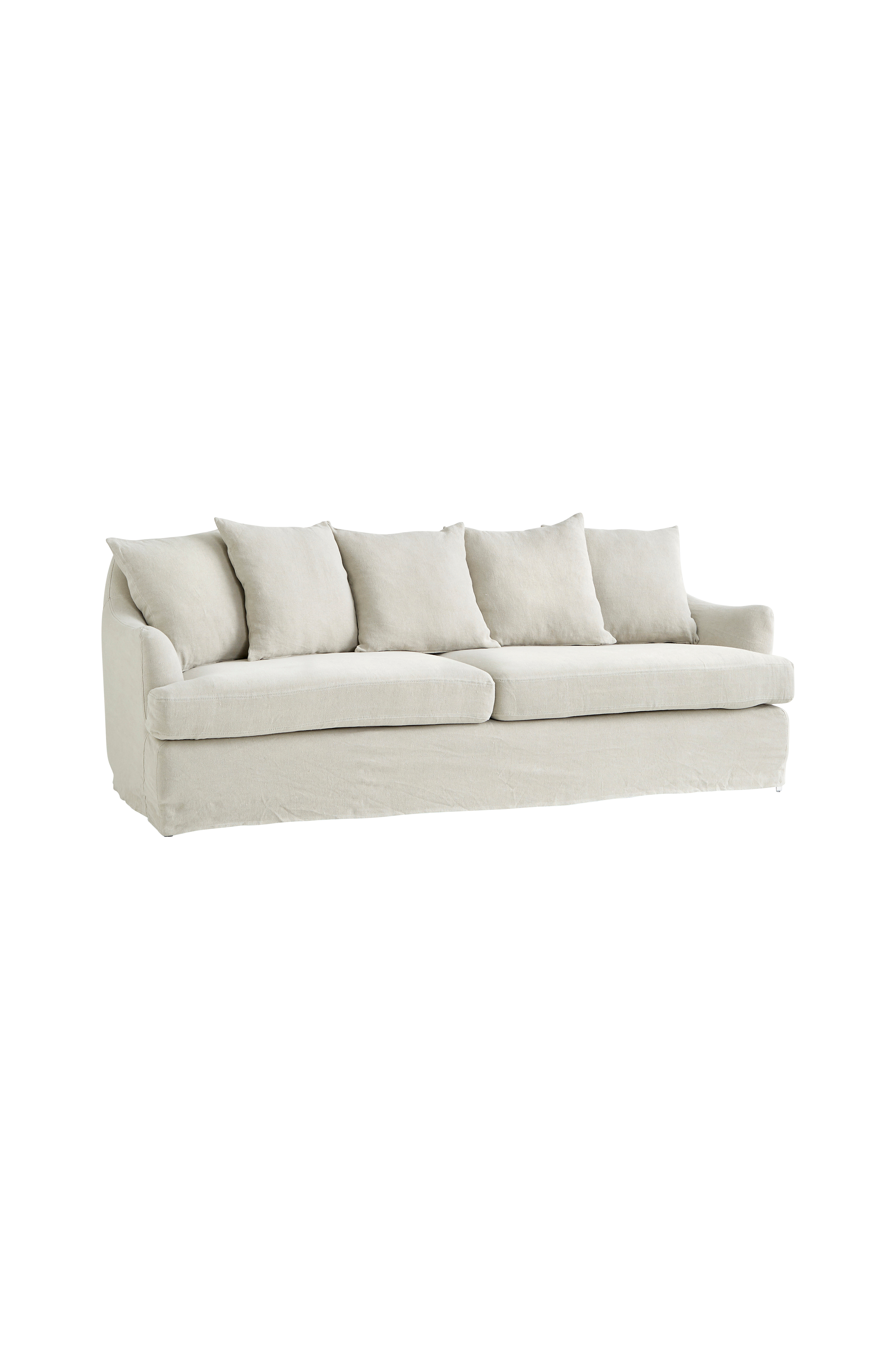 Soffa i romantisk stil med runda former och 5 ryggkuddar. Klädsel i 100% lin. Klädseln är avtagbar och tvättbar i 40 grader. Stomme av plywood och massiv furu. Fyllning av PU-skum och fiber i sits och kuddar. Ben av metall. Mått: Bredd 210 cm, höjd 77 cm, djup 86 cm. Sitthöjd 43 cm, sittbredd 177 cm, sittdjup 60 cm. Höjd på ben 11 cm.